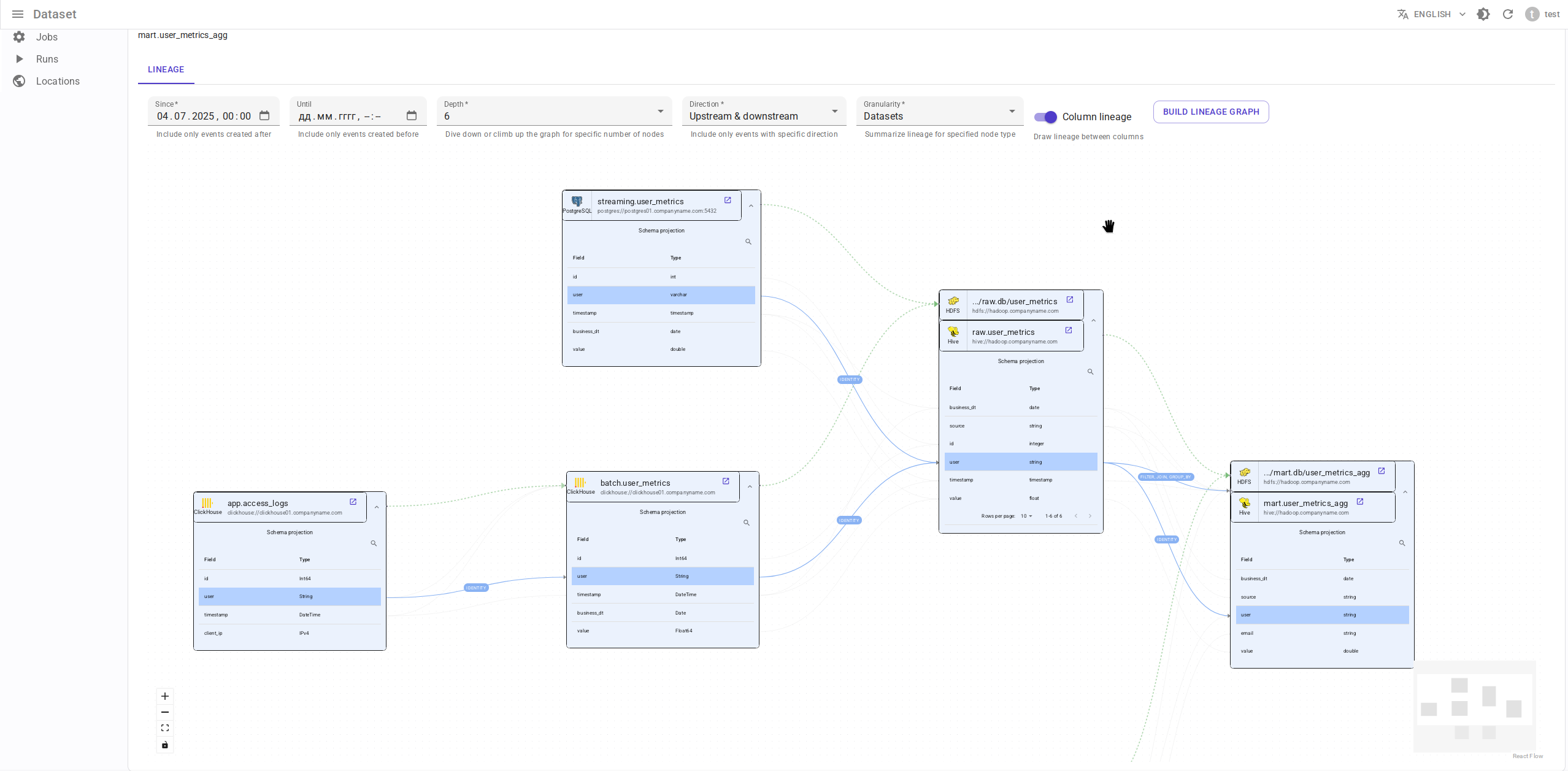 Граф lineage на уровне колонок наборов данных (dataset)
