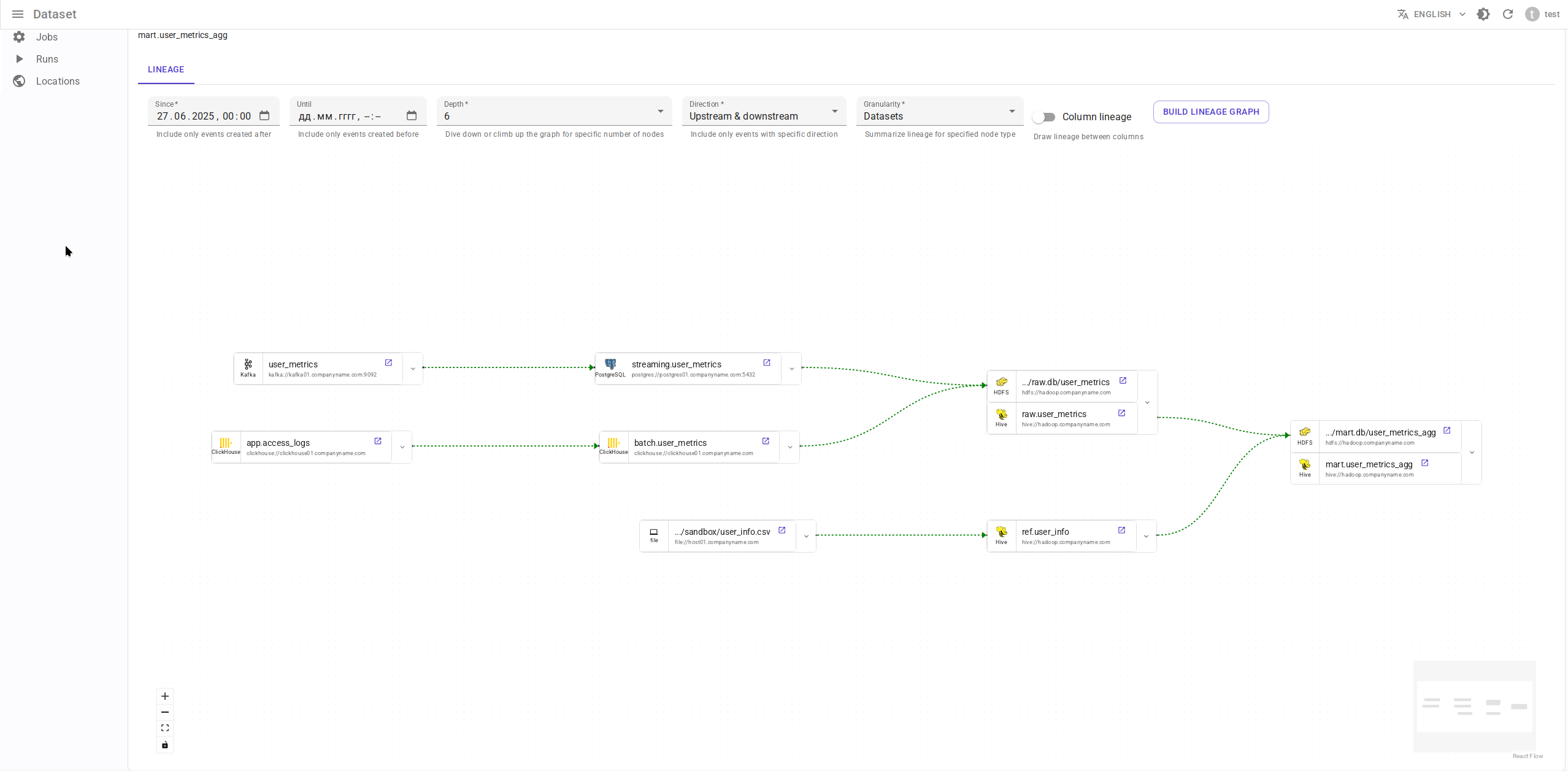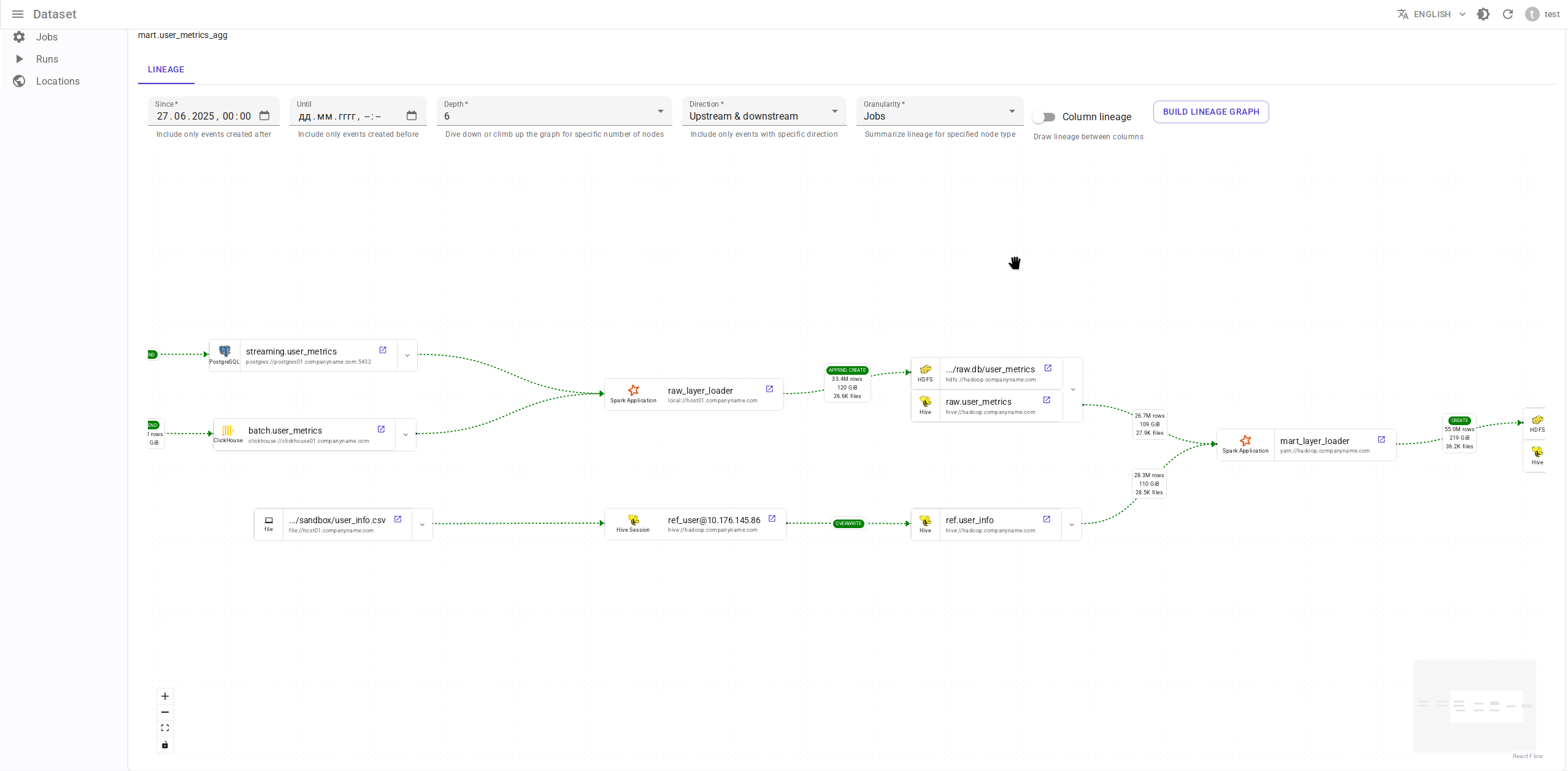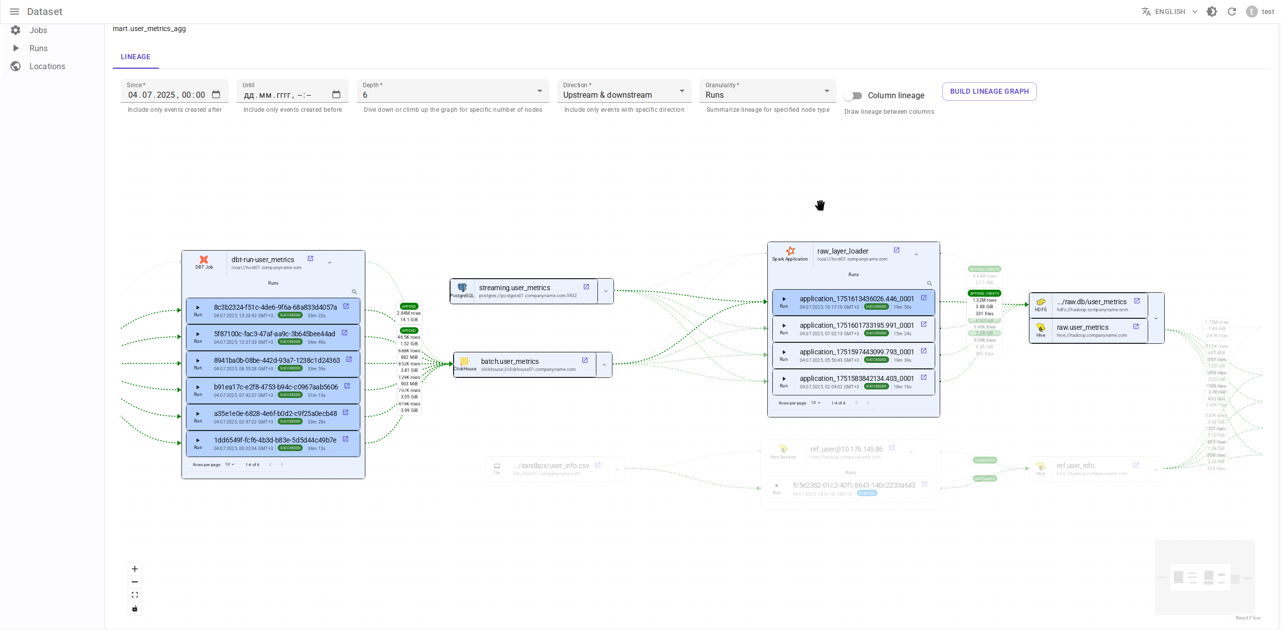 - Граф lineage строится с пользовательскими временными границами (в отличие от Marquez, где граф строится только для последнего запуска задачи).