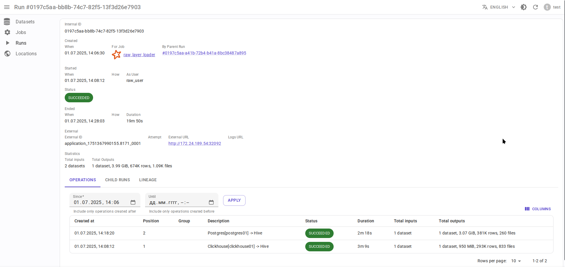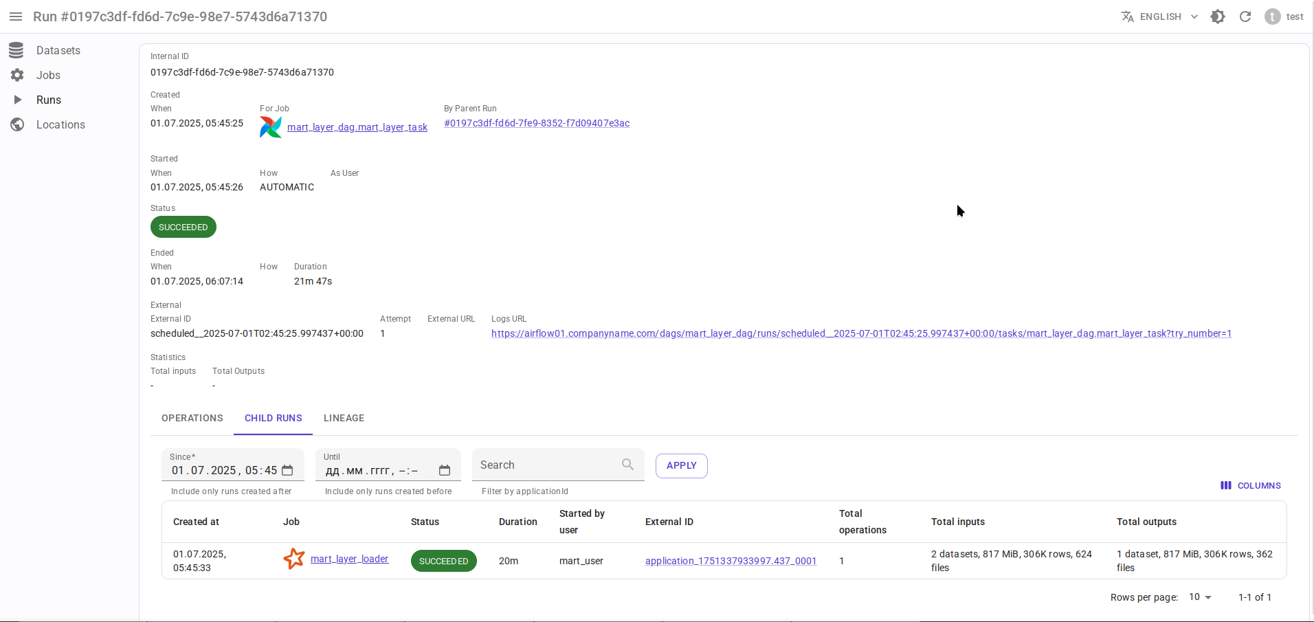 Граф lineage на уровне запусков Run