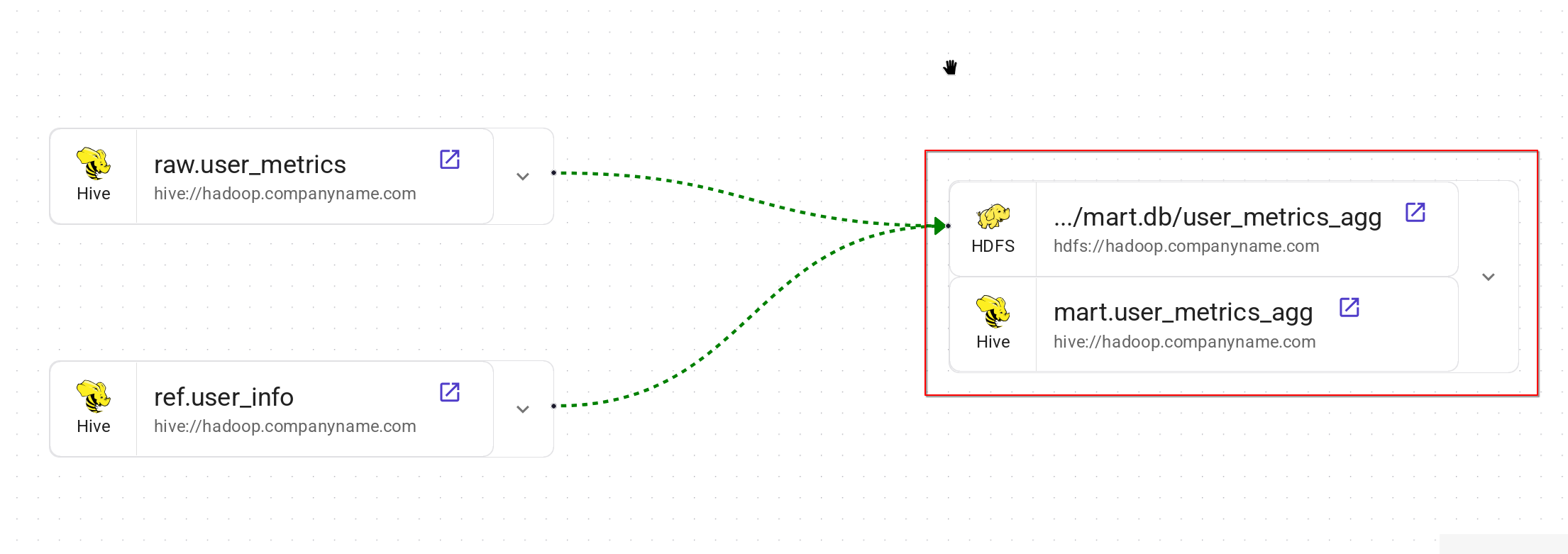 hive://some-cluster+myschema.mytable- таблица внутри кластера Hive.postgres://some.host.name:5432+mydb.myschema.mytable- таблица внутри экземпляра Postgres.hdfs://some-cluster+/app/warehouse/hive/managed/myschema.db/mytable- папка внутри кластера HDFS.