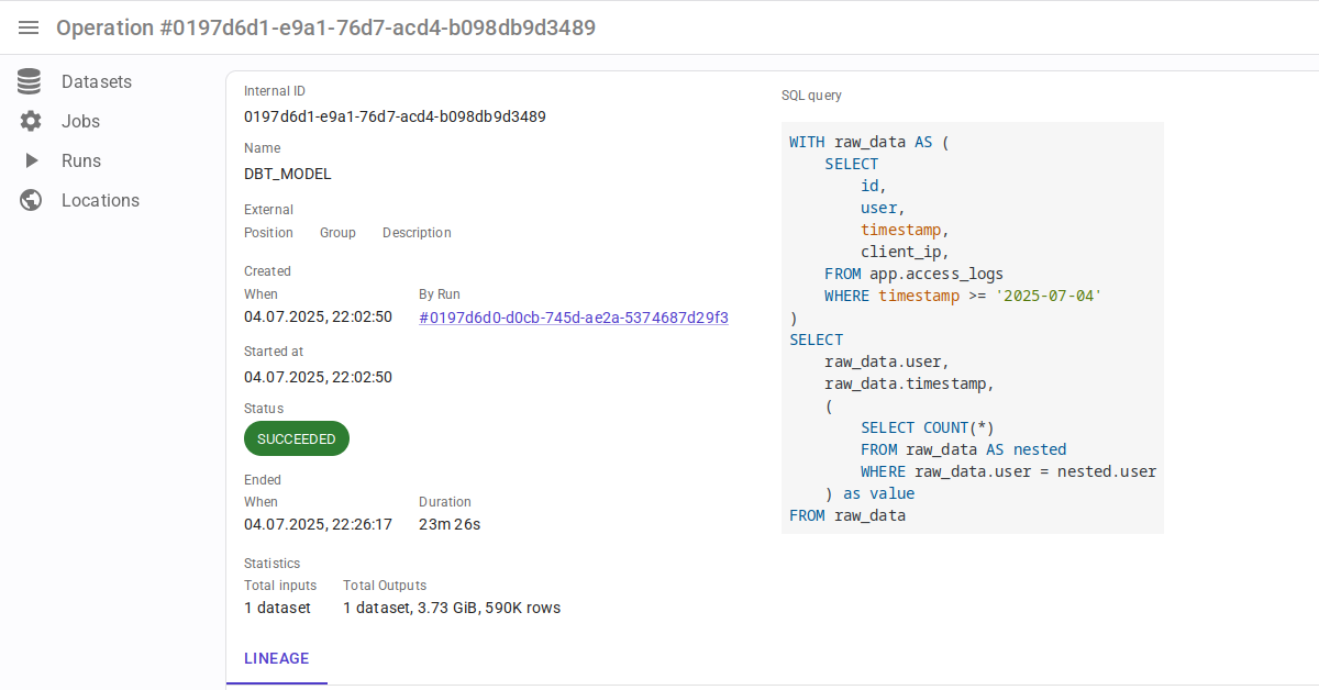position: int | None- позиционный номер операции, например, номер выполнения Spark в Spark UI илиmap_indexзадачи Airflow. -