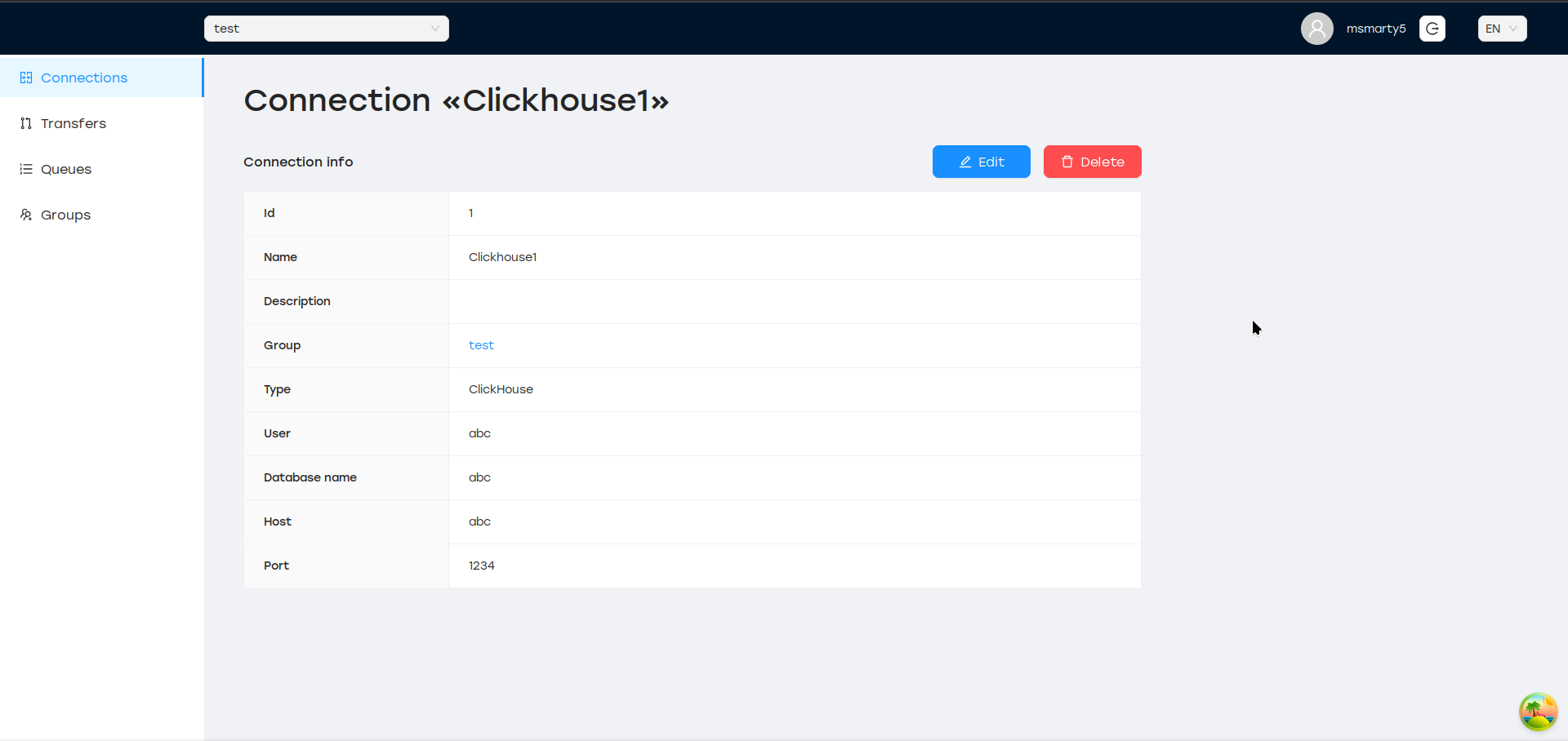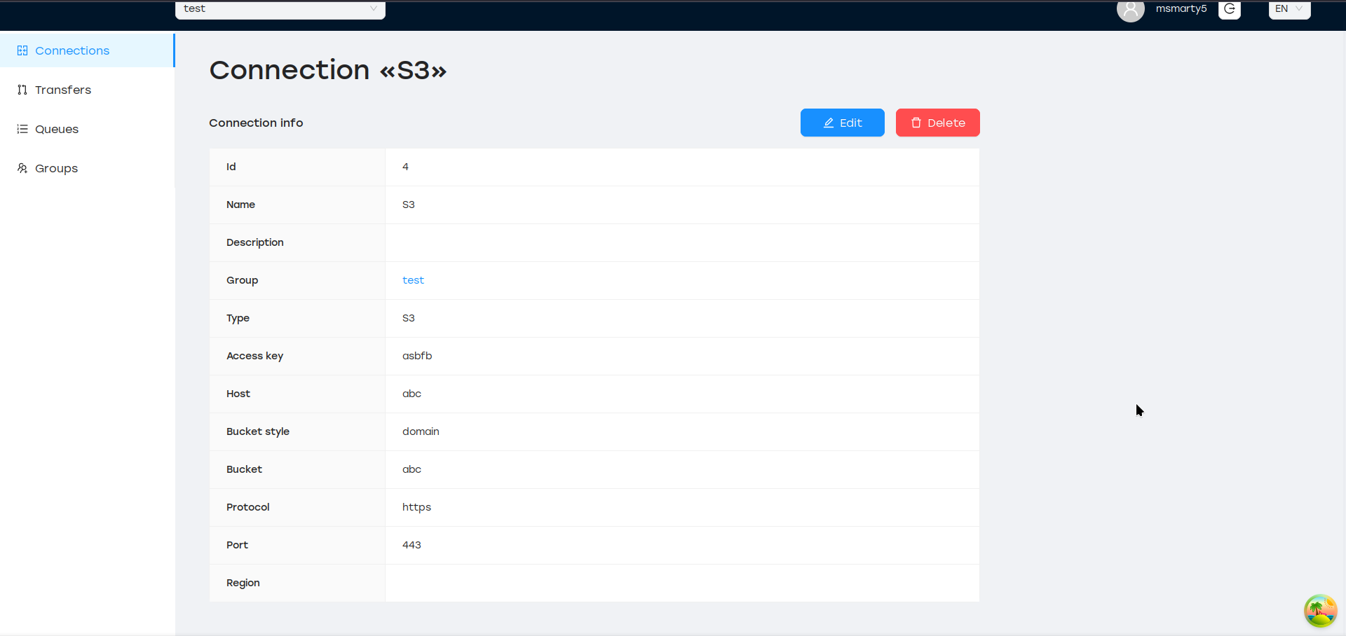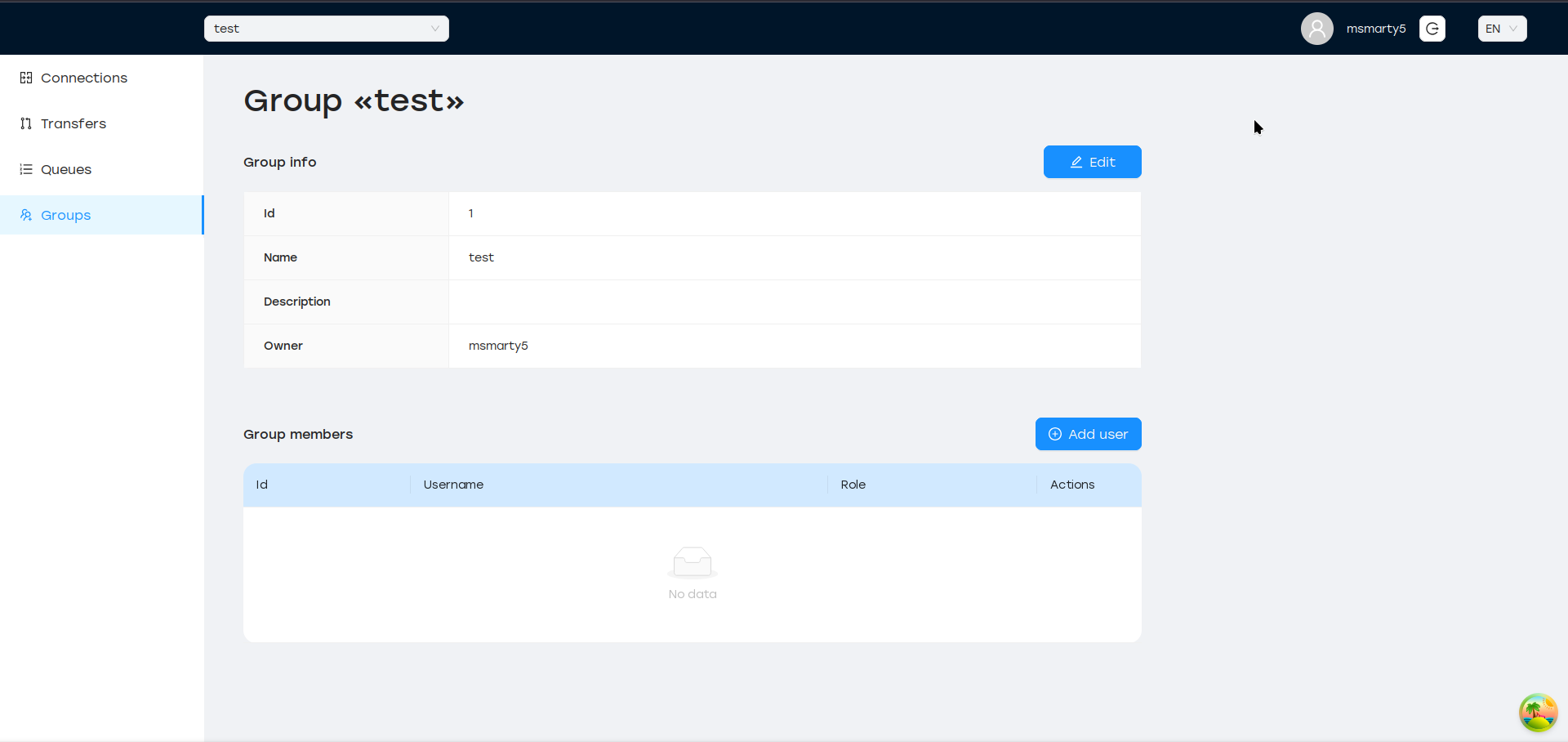 Все типы сущностей (Подключение, Передача, Выполнение, Очередь) могут быть созданы только внутри определенной группы. Группы независимы друг от друга и имеют глобально уникальное имя.