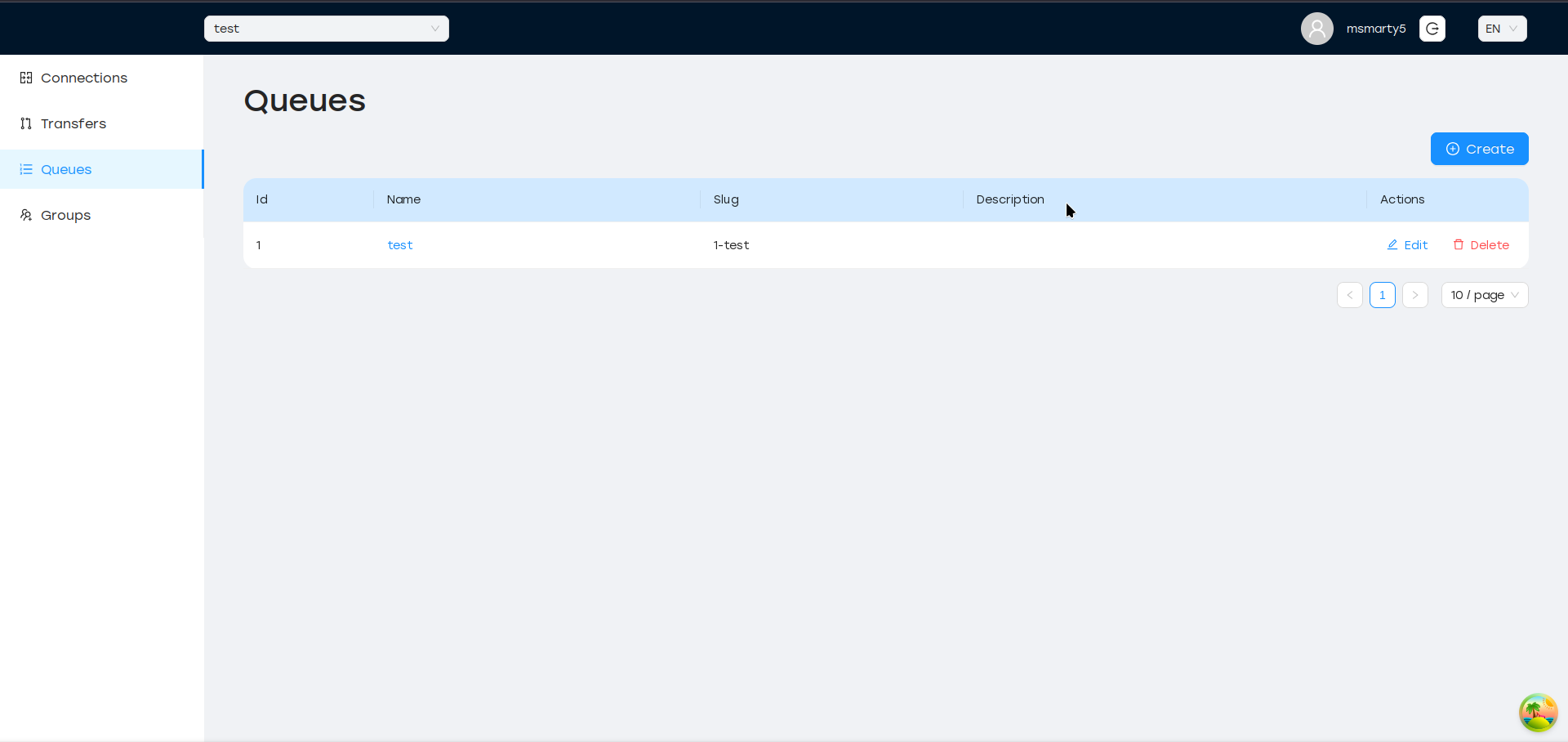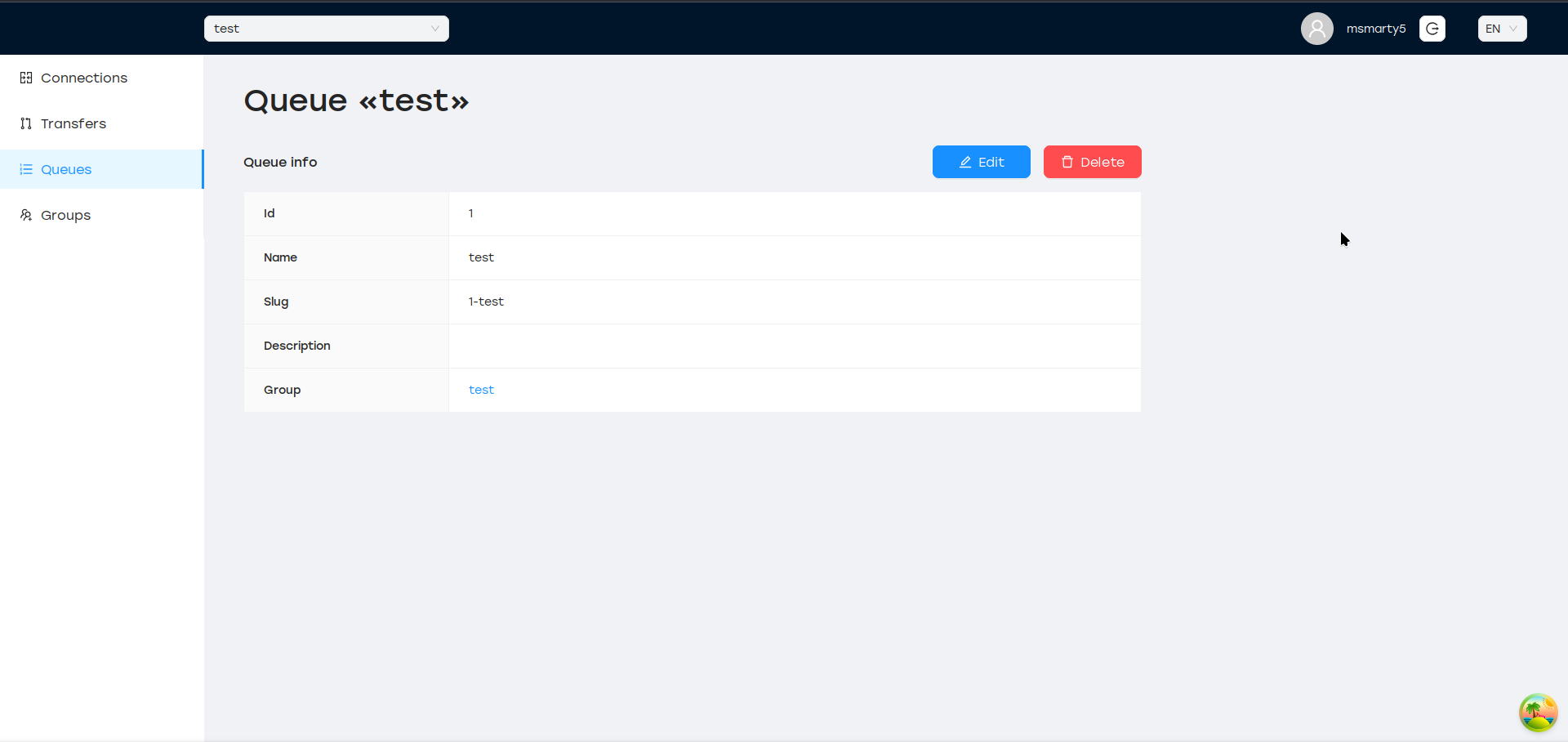 Очередь имеет уникальное имя в пределах группы и глобально уникальное поле slug, которое генерируется при создании очереди.