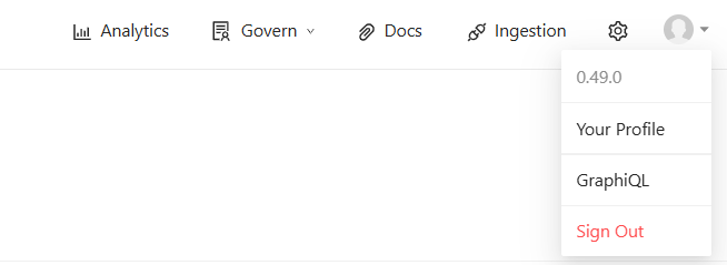Каталог данных предоставляет браузерный инструмент GraphQL Explorer (GraphiQL) для взаимодействия с API GraphQL. Этот интерфейс позволяет вам легко создавать запросы и мутации в отношении реальных метаданных, хранящихся в Каталоге данных. Для написания запроса с помощью GraphiQL необходимо нажать на иконку пользователя и выбрать GraphiQL.