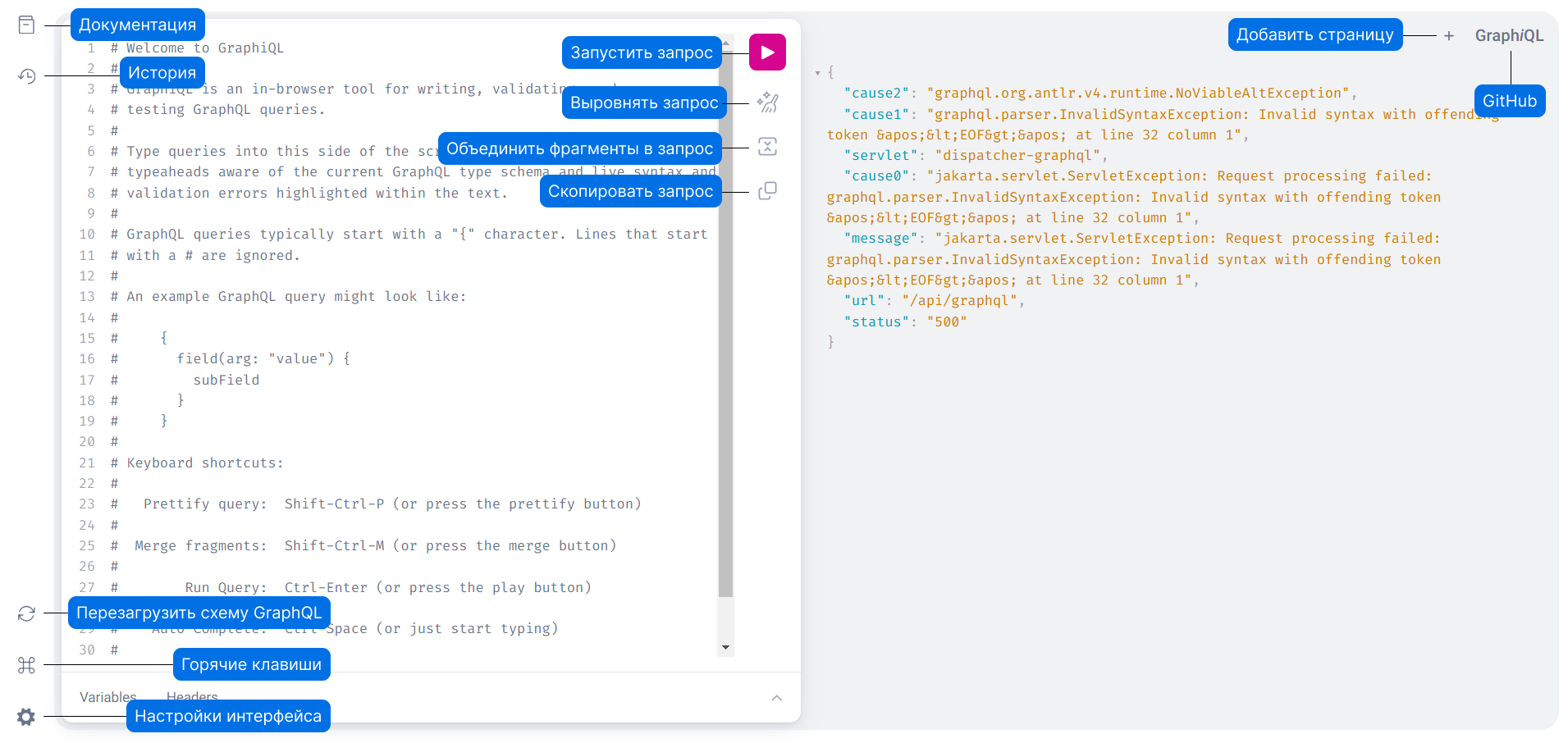 Чтобы выполнить запрос GraphQL необходимо нажать кнопку Execute Query (треугольник на розовом фоне) или нажать Ctrl + Enter. Ознакомиться с документацией по GraphiQL можно по кнопке в верхнем левом углу.