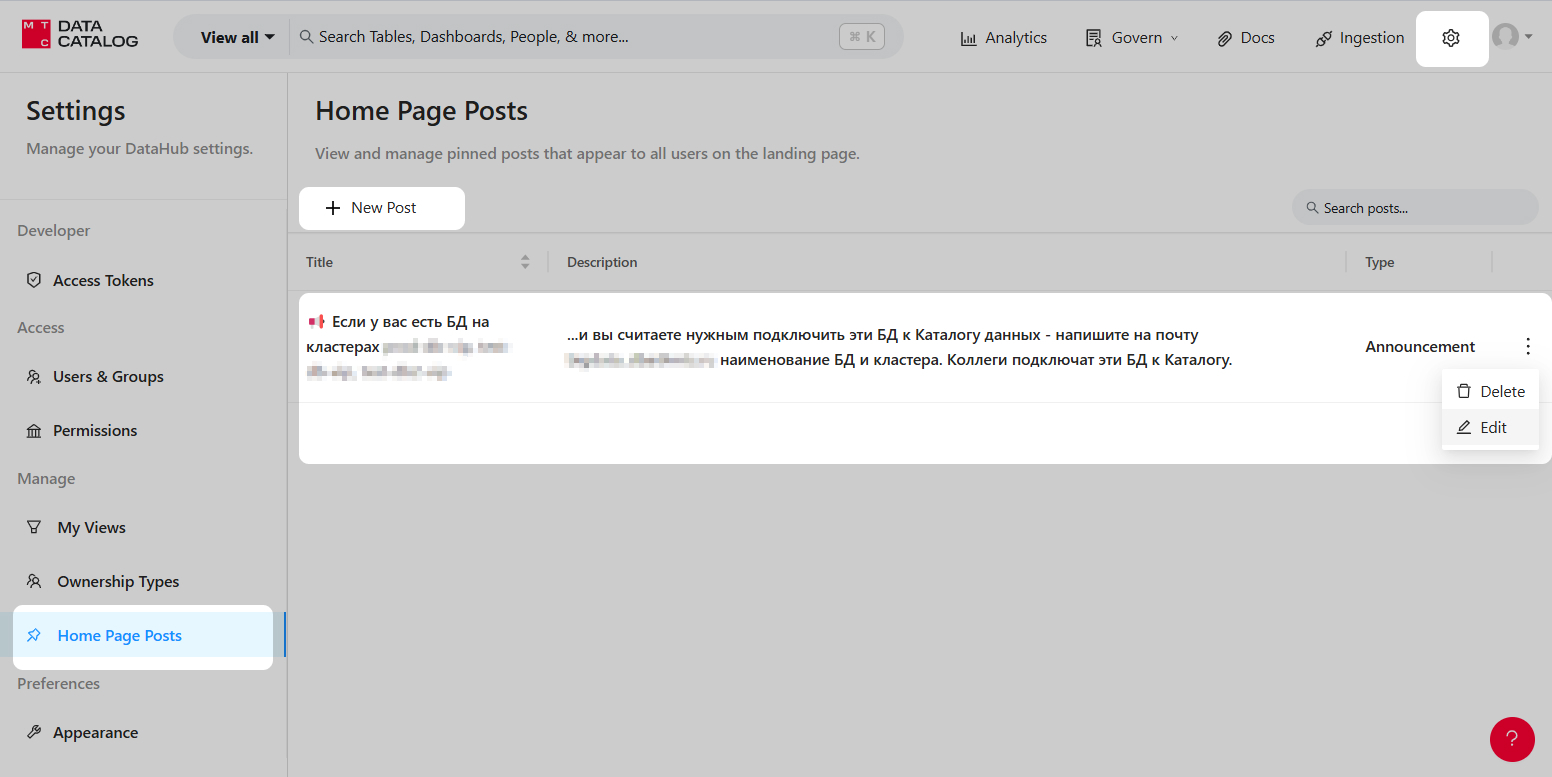 Посты (или закрепленные сообщения) на главной странице Каталога данных служат для информирования пользователей о важных изменениях, событиях и других значимых новостях. Они будут видны всем пользователям сразу под строкой поиска, при открытии главной страницы Каталога данных.