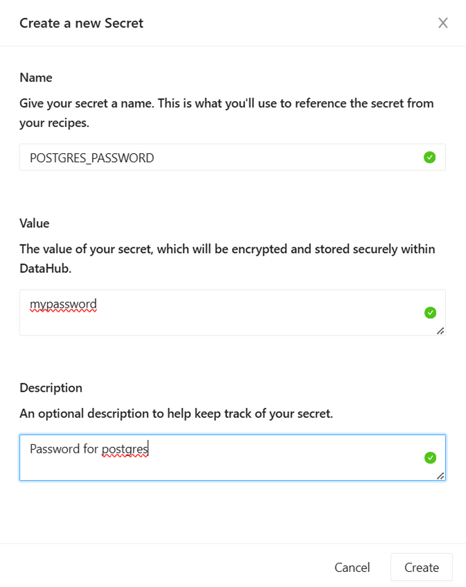В открывшемся окне необходимо ввести название (Name) секрета, на которое в дальнейшем можно ссылаться из рецепта, а так же значение (Value), которое будет храниться в зашифрованном виде в Каталоге. Опциональным является добавление описания, которое должно помогать управлять секретами.