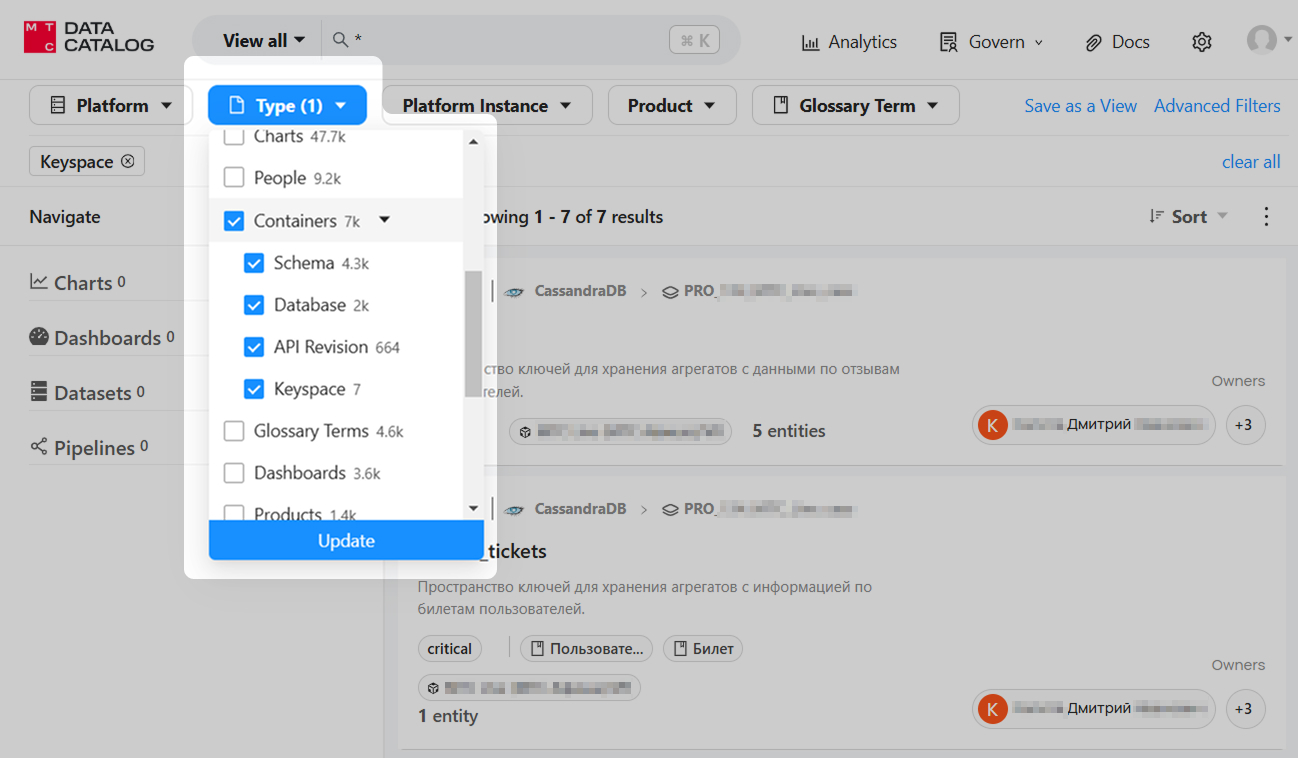 Для просмотра контейнеров, которые существуют в Каталоге можно воспользоваться фильтром Type на странице поисковой выдачи (в зависимости от подключенных источников и других особенностей состав фильтров может меняться). Например, фильтр по типу контейнеров может выглядеть как на рисунке 1: