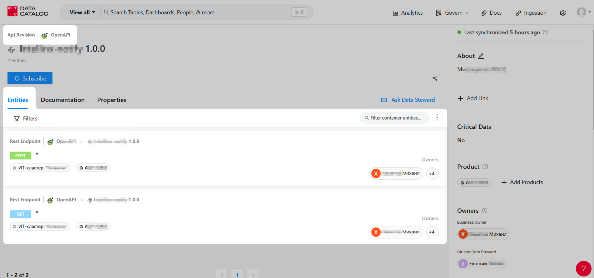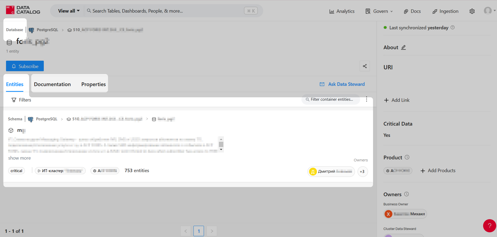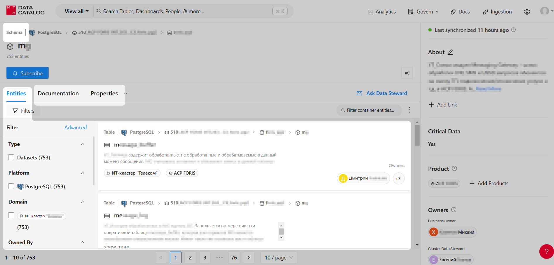Properties (Свойства). Автоматически создаваемые поля, полученные при инджестинге метаданных в Каталог. Они включают техническую информацию, такую как тип платформы, название экземпляра и окружения. Данные могут отсутствовать, если инджестор не смог их извлечь.