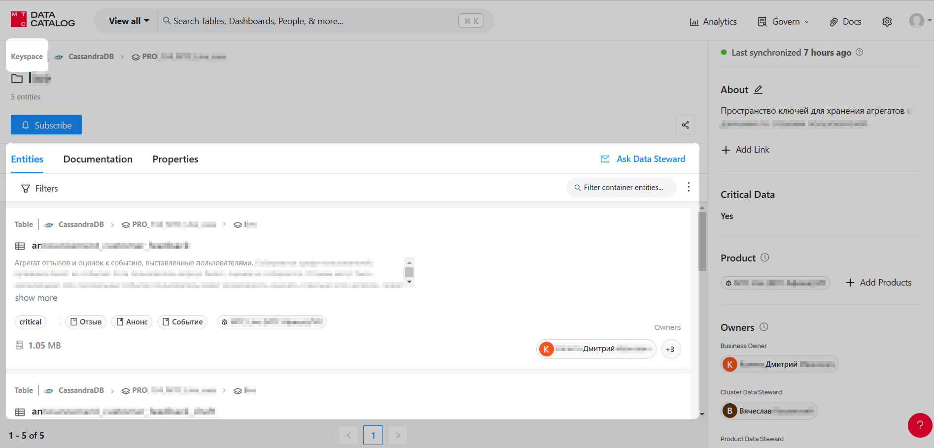Как и другие объекты в Каталоге, контейнер может быть закреплен за продуктом, принадлежать к домену и иметь владельцев, к нему можно добавить теги и термины глоссария. Так же для контейнера доступна функциональность массового редактирования с помощью Excel.