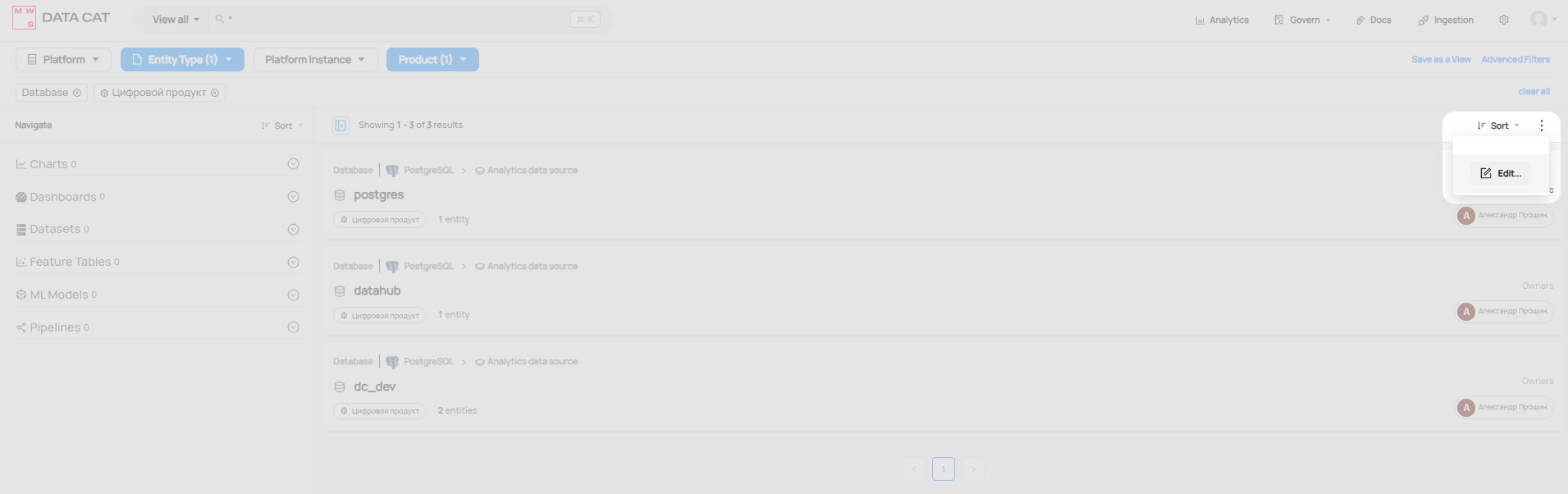 - на странице поисковой выдачи или странице, отображающей дочерние объекты какого-либо объекта, нажать три точки и далее выбрать пункт Edit