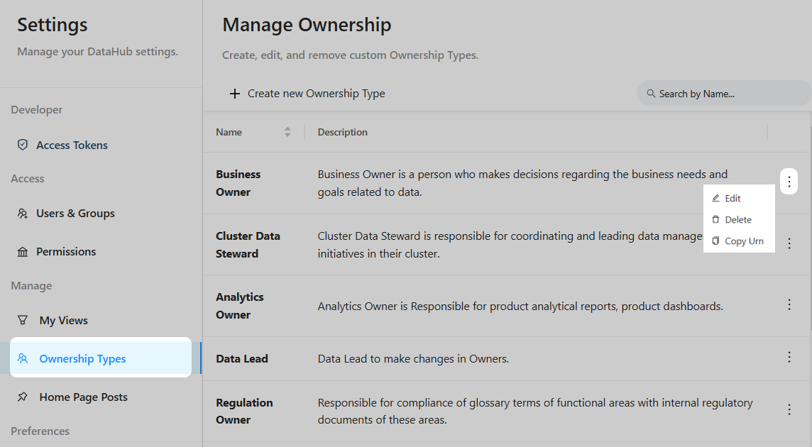Настраиваемыми типами владельцев можно управлять через интерфейс администратора в Каталоге данных. Для этого нужно перейти на страницу Settings > Ownership Types. Чтобы создать новый тип владельца, нажмите кнопку + Create new Ownership Type. В открывшемся модальном окне выберите тип владельца. В форме можно добавить название и описание, которые можно редактировать в дальнейшем.