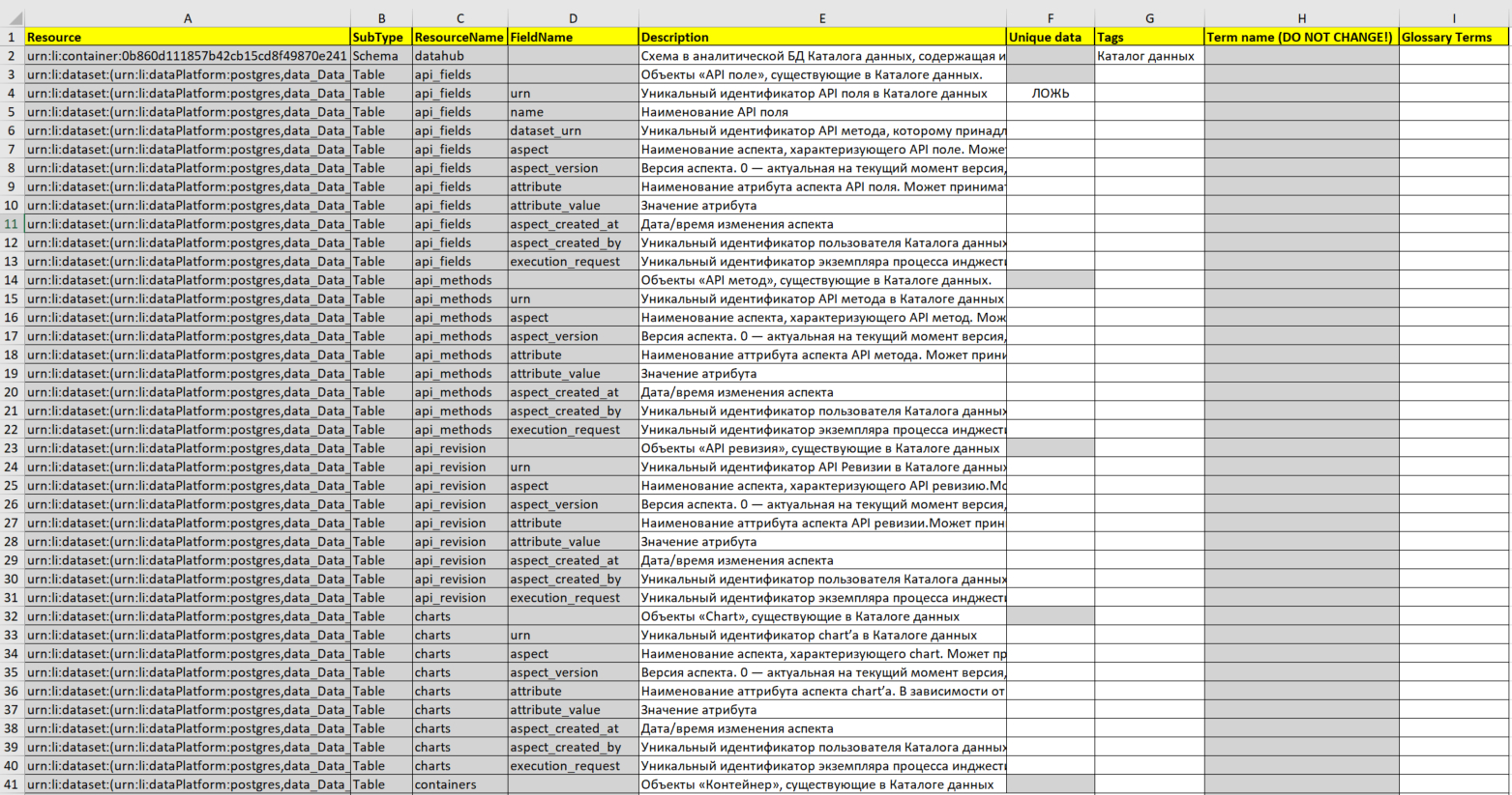 Вы можете внести изменения в выгруженный файл с помощью программного обеспечения для работы с Excel-файлами (Microsoft Excel, Google Таблицы, LibreOffice). Поля доступные для изменения будут показаны на белом фоне в вашем редакторе файлов, недоступные - на сером.