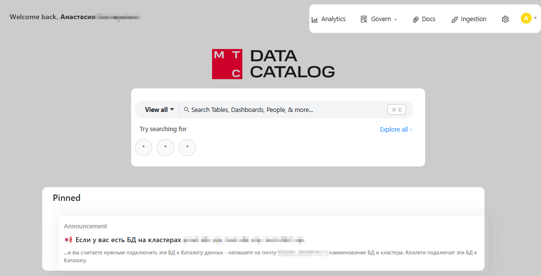 Инджесторы (Ingestion): Для пользователей с расширенным доступом доступна также страница просмотра инджесторов - Ingestion. Эта страница позволяет отслеживать и управлять процессами загрузки метаданных.