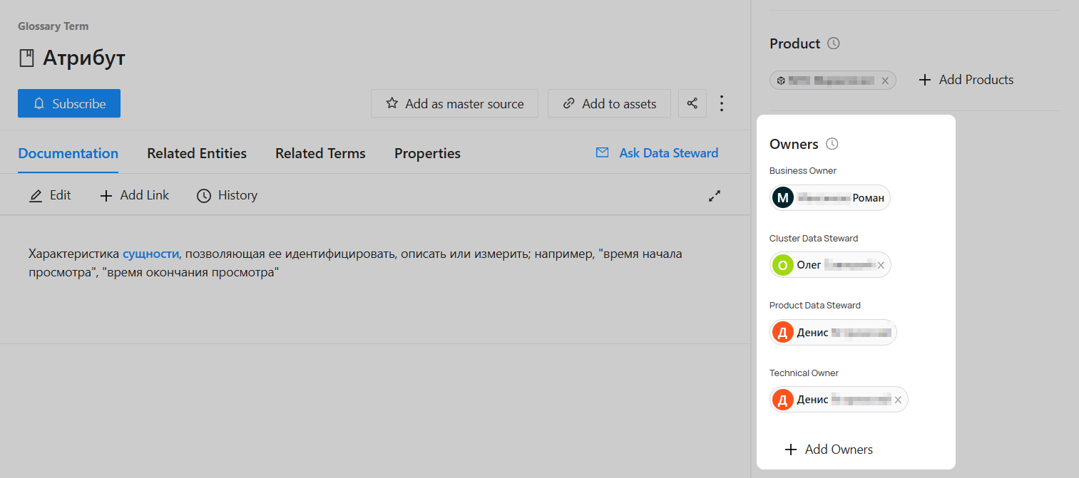 Чтобы добавить владельца для какого-либо объекта Каталога данных (домена, термина, датасета и др), нужно нажать кнопку + Add Owners в правой боковой панели.