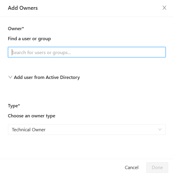 В открывшемся окне, в обязательном поле Owner, выберите нужного вам пользователя или группу пользователей, которых хотите добавить владельцами. Затем выберите тип владельца, который будет отражать взаимосвязь между объектом (домена, термина, датасета и др) и пользователем. Для завершения редактирования нажмите Done. В интерфейсе пользователя в разделе Owners отобразятся внесенные изменения.