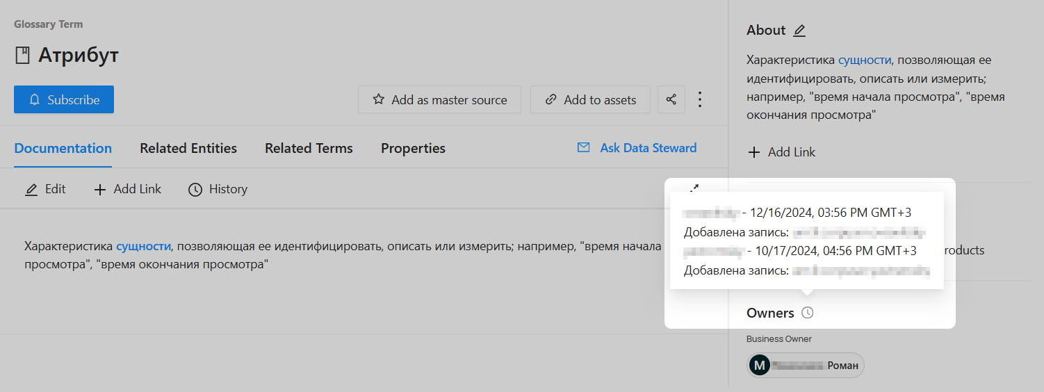 В интерфейсе пользователя в разделе Owners можно просмотреть историю изменения владельцев. Для этого необходимо навести курсор на значок часов справа. На появившемся тултипе можно посмотреть кто и когда внес изменения, а также во второй строке просмотреть какое изменение было произведено.