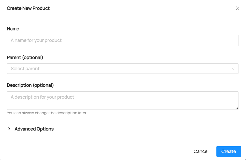 Создать Продукт можно по нажатию одной из двух кнопок на странице Продуктов: + или кнопки + New Product. В открывшемся окне обязательно указать наименование создаваемого Продукта. Дополнительно можно выбрать родительский Продукт из списка уже существующих (создаваемый Продукт станет дочерним), а также сразу указать описание Продукта. Имя, описание и родительский Продукт можно изменить позже.