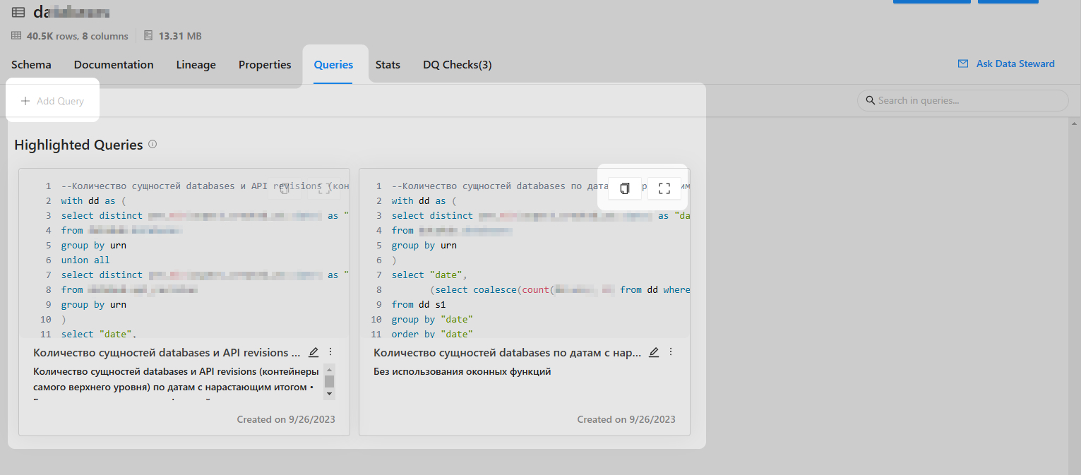 Страница запросов предоставляет пользователям доступ к общим SQL-запросам, связанным с текущим набором данных. Эти запросы создаются владельцами данных и позволяют делиться полезными запросами с другими пользователями.