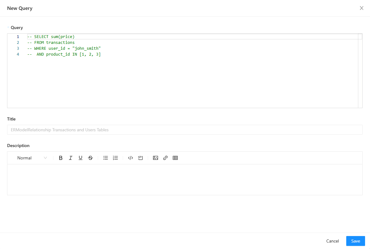 - В поле Description предоставьте подробное описание назначения запроса. Например, уточните, что запрос используется для вычисления суммы товаров, приобретенных пользователем с именем john_smith.
