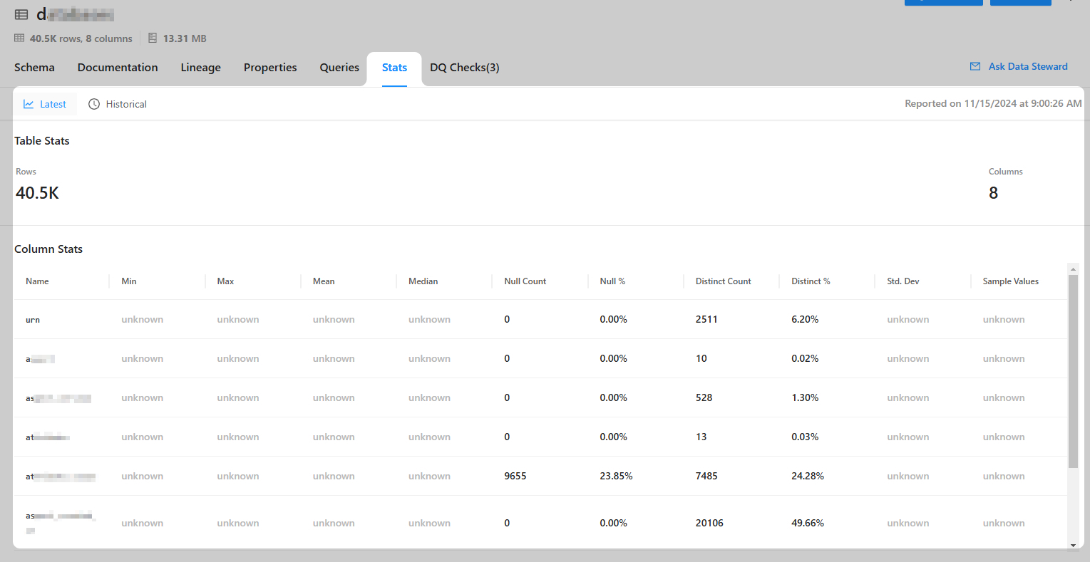 Для просмотра истории профилирования необходимо перейти в раздел Historical. Здесь представлены три раздела Profiling Runs - ссылки на данные профилирования при предыдущем запуске инджестора, Table Stats - статистика по таблицам, Column Stats - статистика по колонкам/полям.