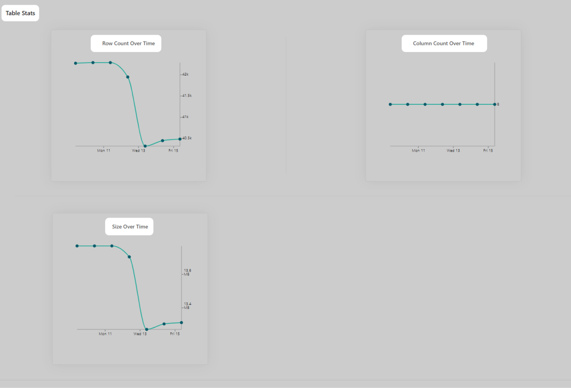 Статистика таблицы визуализирует исторические данные по датасету. Первые три графика показывают, как изменялся датасет за выбранный период времени (фильтр в правом углу):