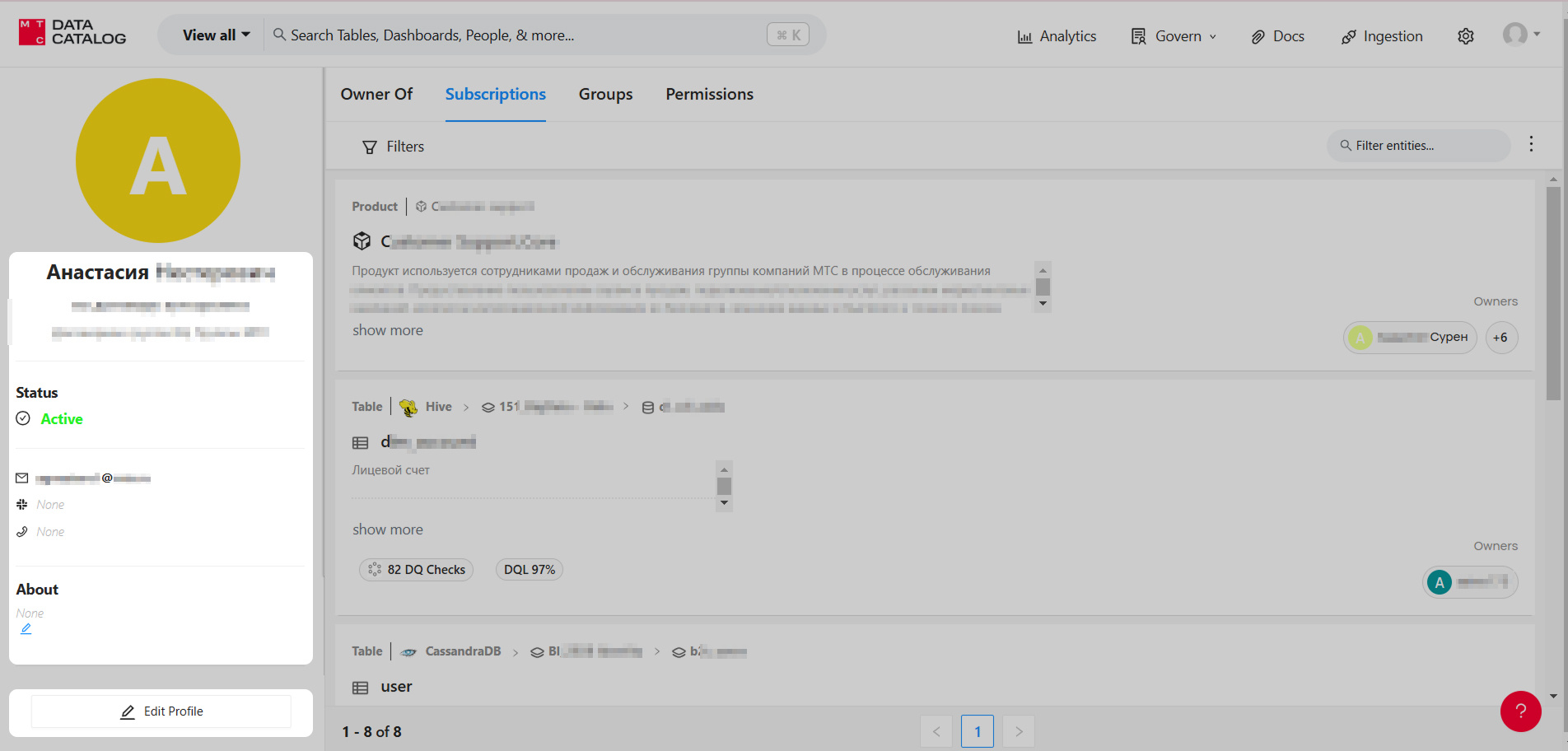 Раздел Subscriptions отображает активные подписки пользователя на различные объекты. Просмотреть подписки можно только для своей учетной записи. Подробную инструкцию о том, как подписаться на объекты Каталога, можно найти в разделе Подписки в Каталоге данных.