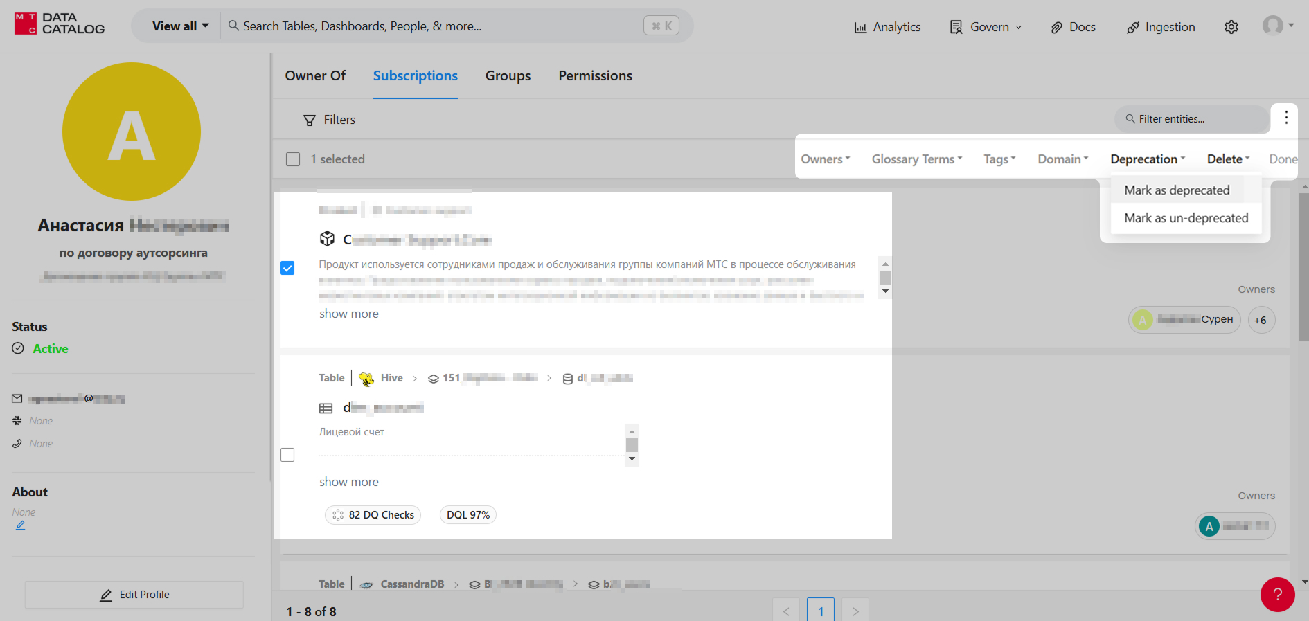 Обладая правами редактирования объектов можно удобно редактировать объекты со вкладки Owner of или Subscriptions на странице пользователя. Для этого выберите три точки справа на экране, а затем выберите объект или объекты, которые необходимо изменить, отметив чекбоксом слева от названия. В зависимости от выбранных объектов, вам станут доступны функции изменения следующих атрибутов: