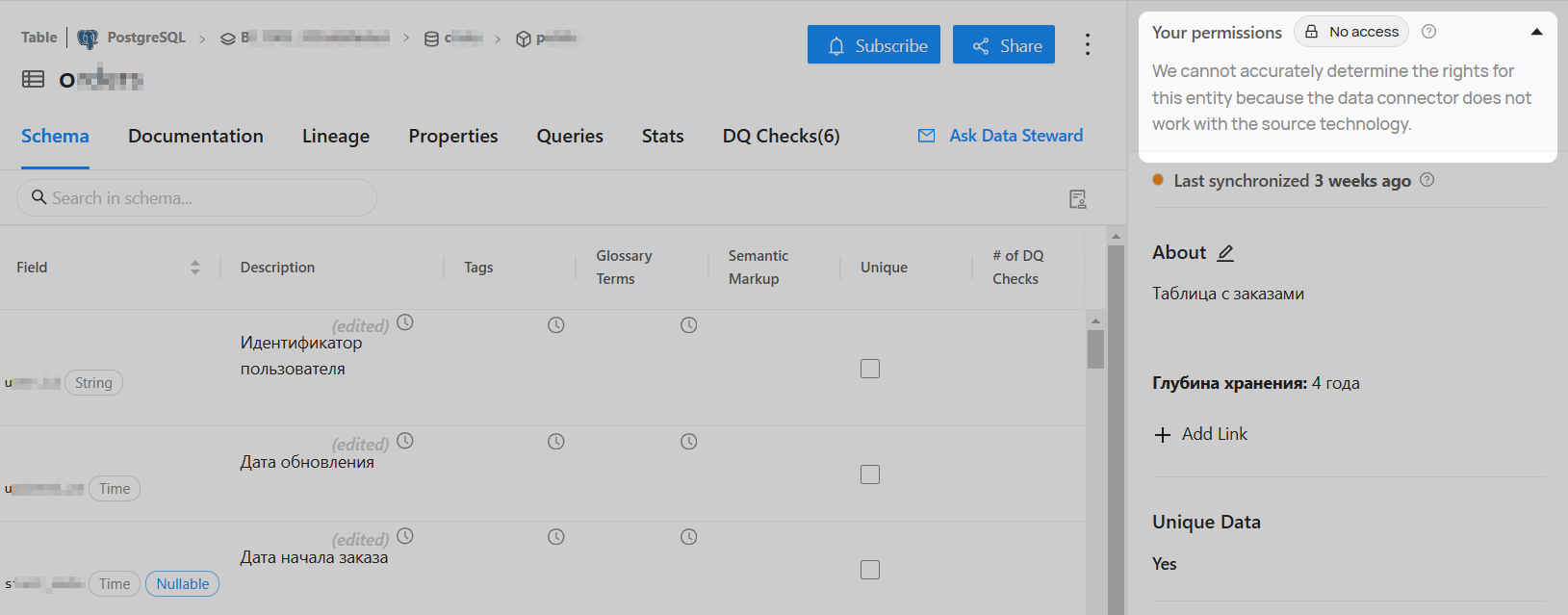 Важно. Возможен вариант, когда Каталог данных не может определить ваш уровень доступа к объекту, тогда и для связанных сущностей уровень доступа будет не определен.