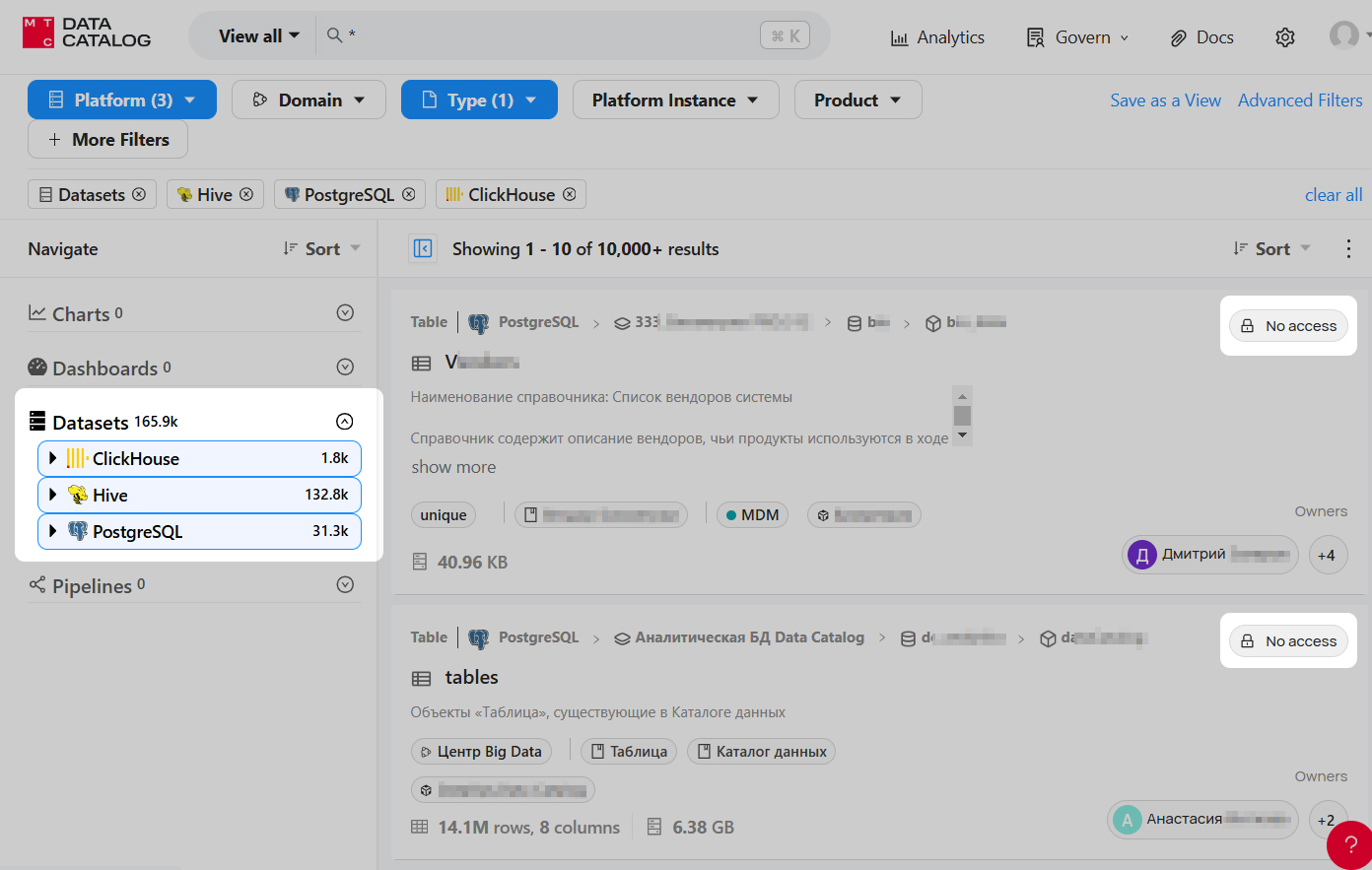 У вас могут быть права на чтение - Reader, редактирование - Edit или не быть прав к объекту - No access. Бейдж со значением No access также получат объекты для которых Каталог данных не может определить права.