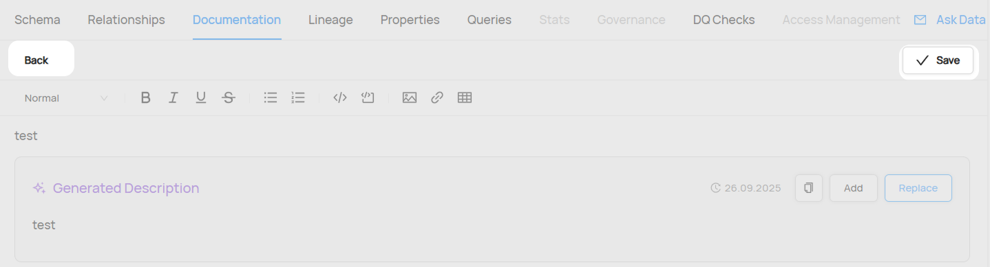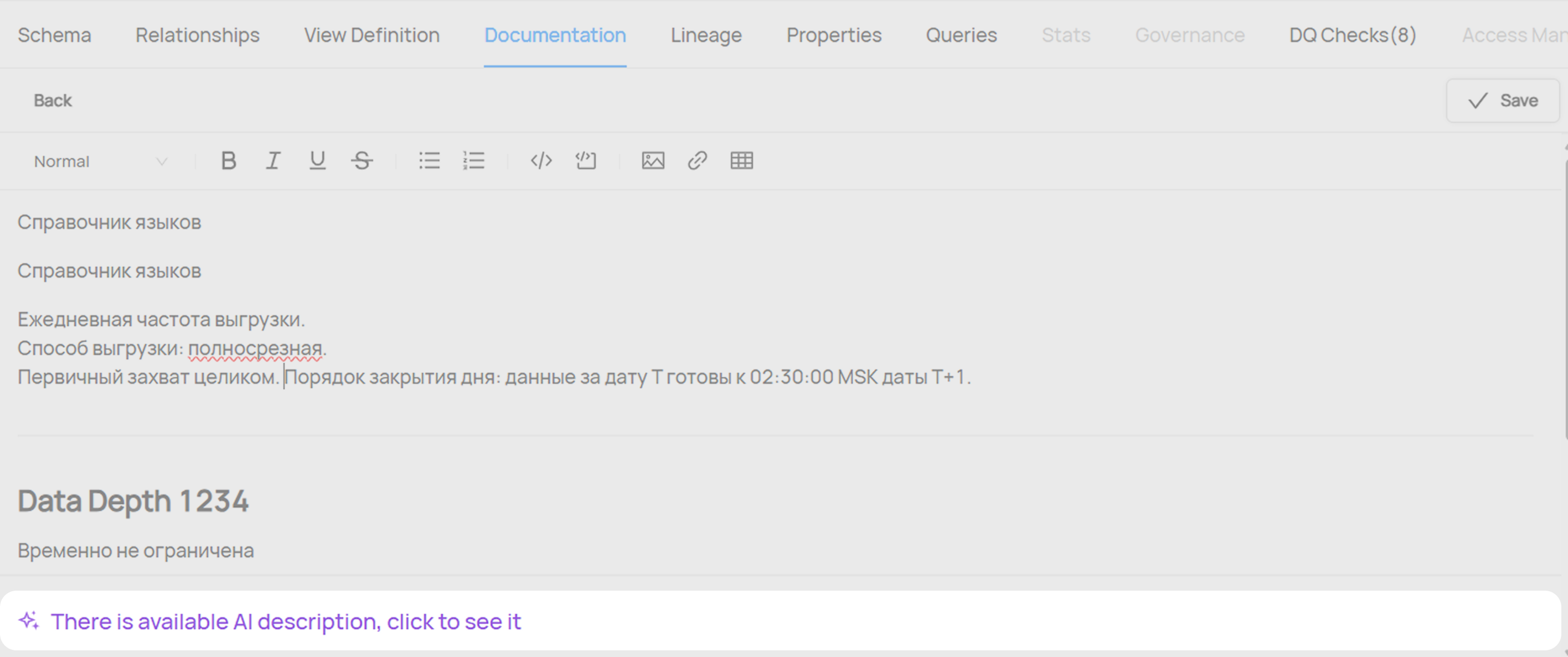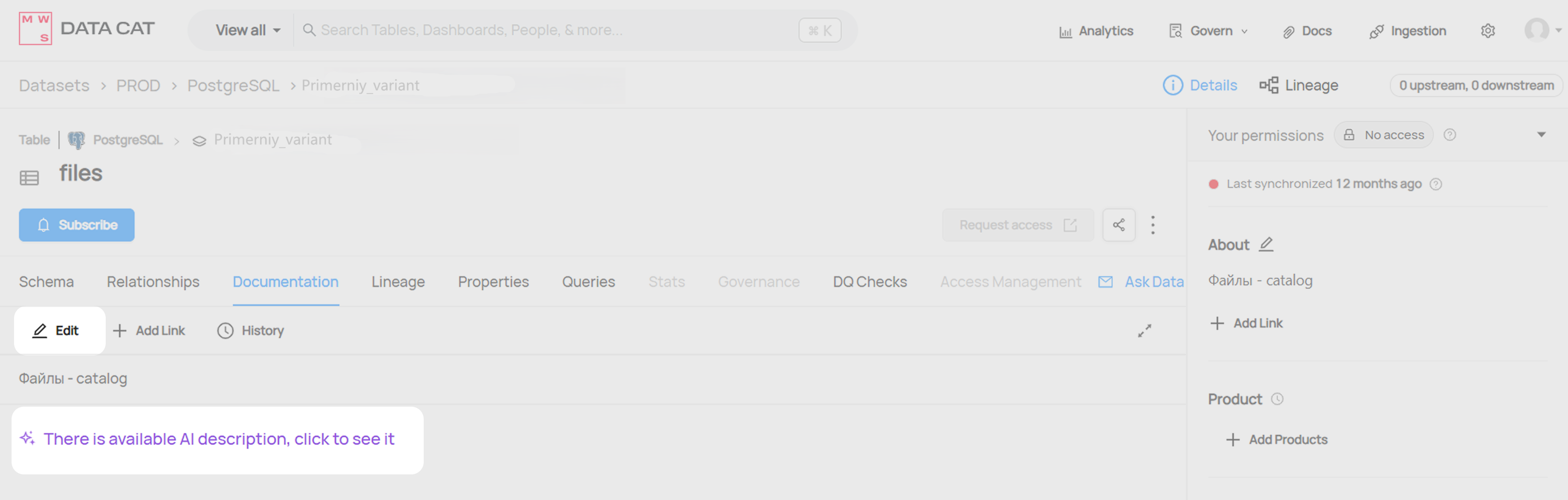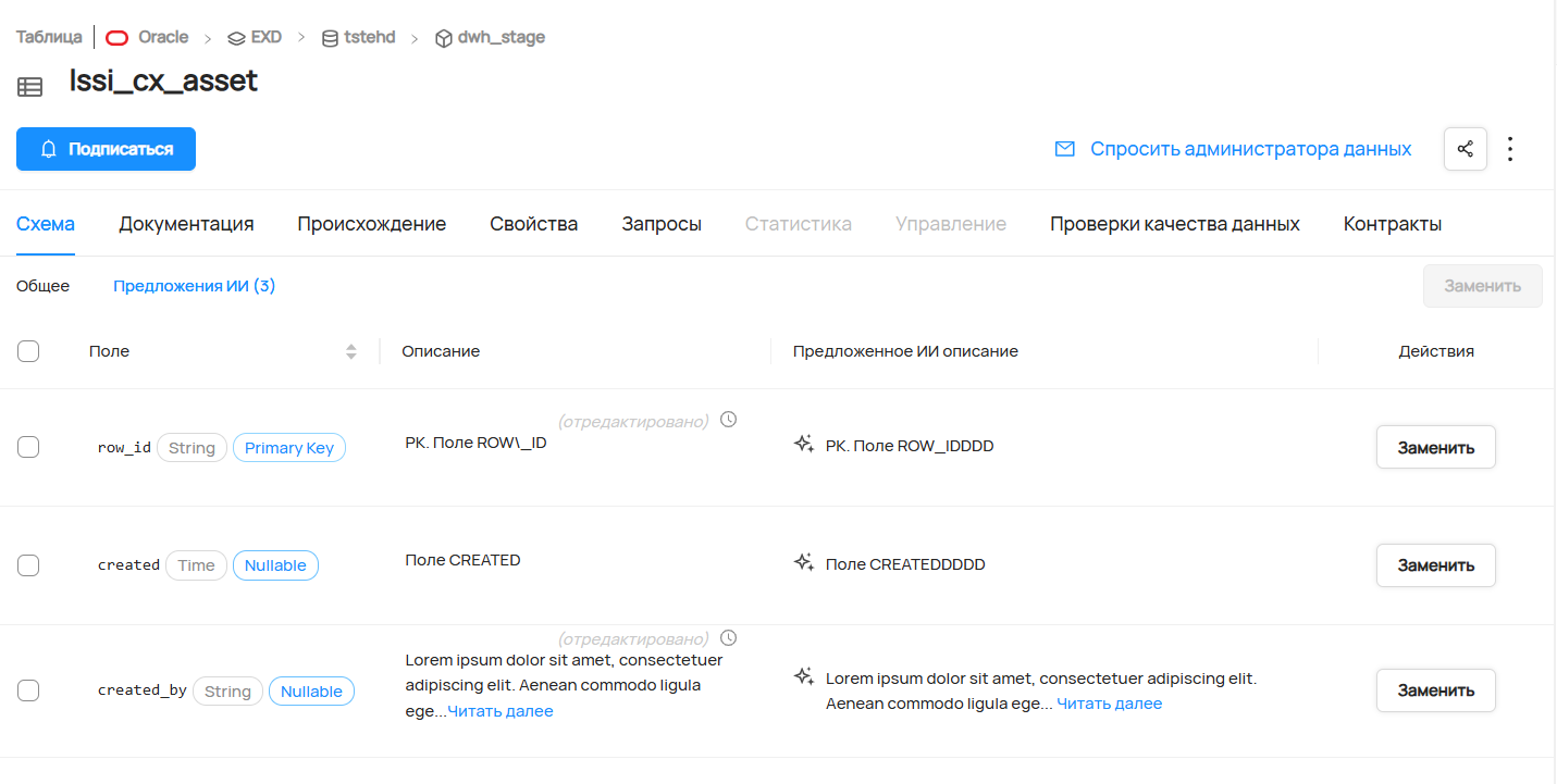 - Edit Entity - возможность редактировать все атрибуты датасета, в том числе, возможность видеть AI-сгенерированные описания при редактировнии датасета и их столбцов (полей).