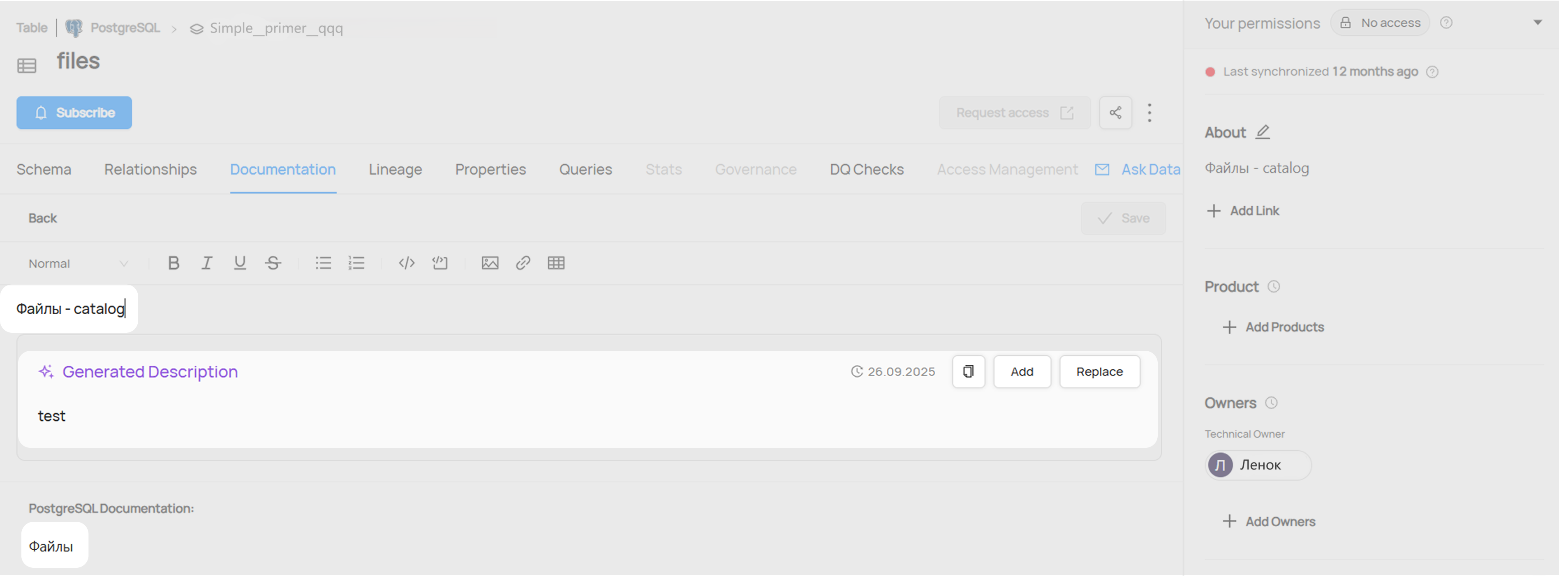 Важно: чтобы была возможность сохранить внесенные в описание датасета изменения, нужно иметь привилегию Edit Entity или Edit Description.