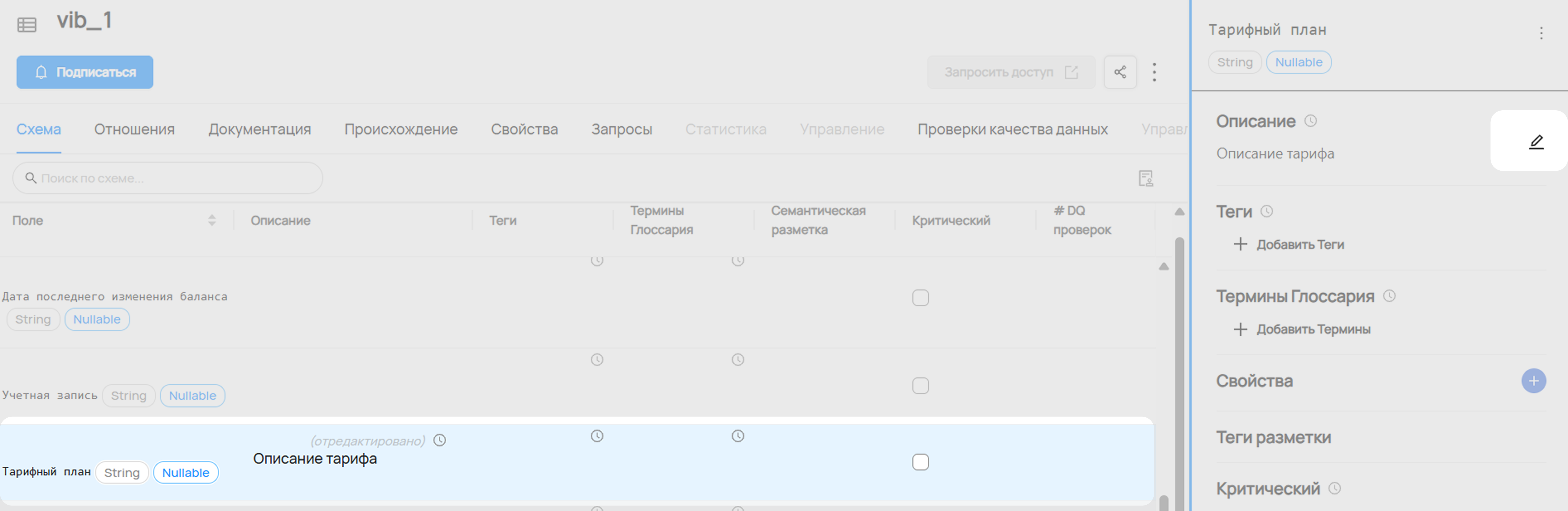 Для этого на странице датасета на вкладке Schema (Схема) выделите нужное поле и нажмите на кнопку редактирования в правом боковом меню.