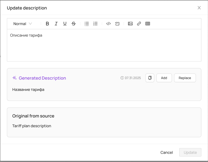 Кнопки для работы с AI-описанием аналогичны описанным выше.