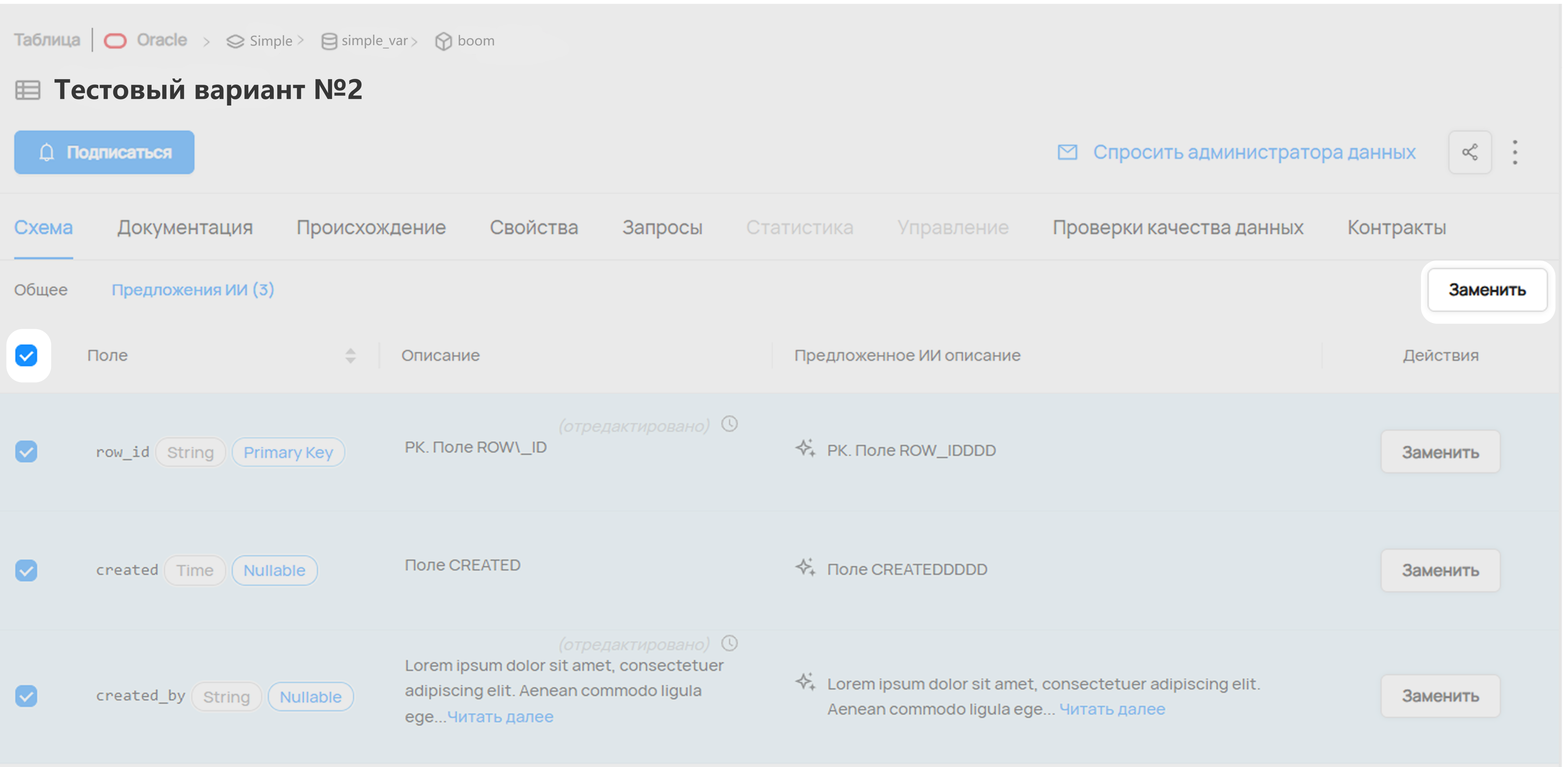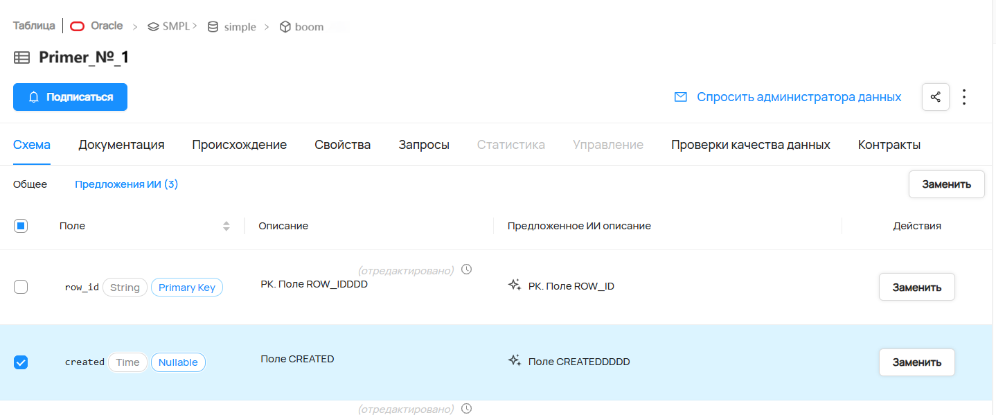 На странице датасета в разделе Schema на вкладке AI Suggestions (Предложения ИИ) можно посмотреть все сгенерированные AI-описания столбцов.