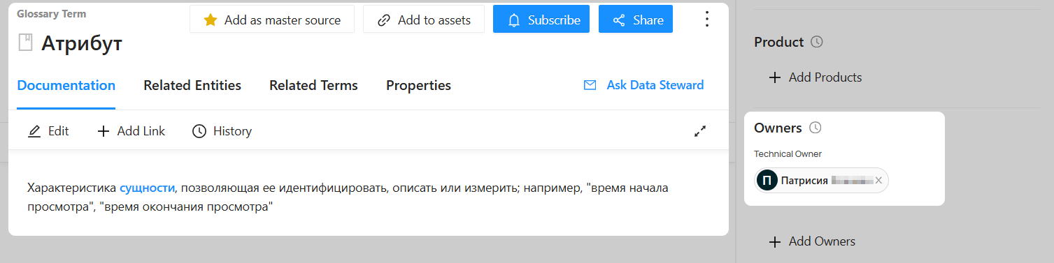 Настраиваемый тип владельца представляет собой механизм для определения отношений владения между пользователями и объектами, которыми они управляют в Каталоге данных. С помощью пользовательских типов владельцев можно интегрировать номенклатуру, уже применяемую в организации, в интерфейс Каталога данных. Это, в свою очередь, упрощает взаимодействие с метаданными для новых пользователей, позволяя им быстрее адаптироваться и ориентироваться в системе.
