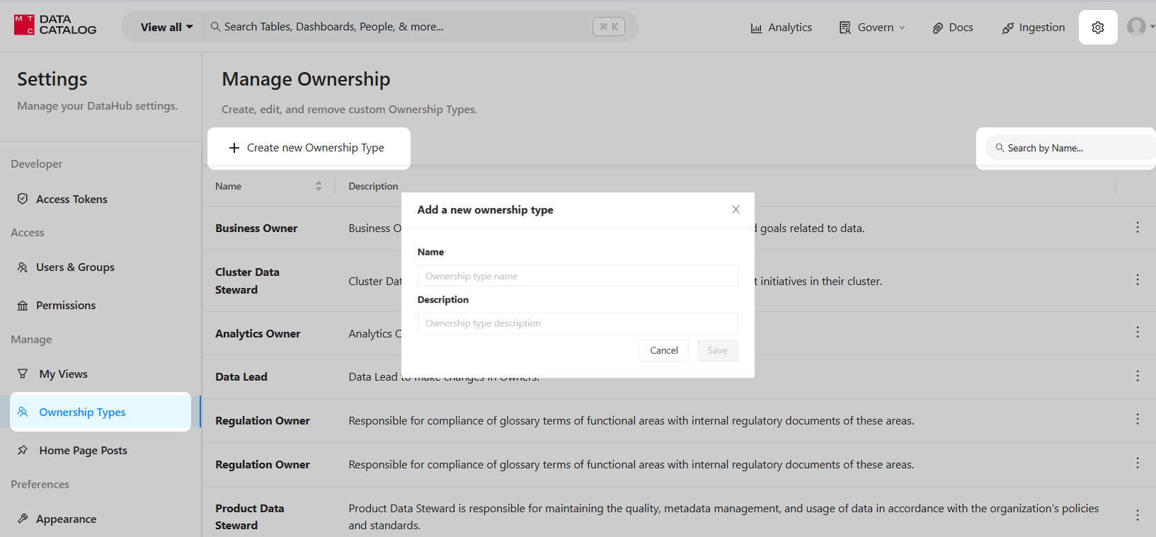 Настраиваемыми типами владельцев можно управлять через интерфейс администратора в Каталоге данных. Для этого нужно перейти на страницу Settings > Ownership Types. Чтобы создать новый тип владельца, нажмите кнопку + Create new Ownership Type. В открывшемся модальном окне выберите тип владельца. В форме можно добавить название и описание, которые можно редактировать в дальнейшем.