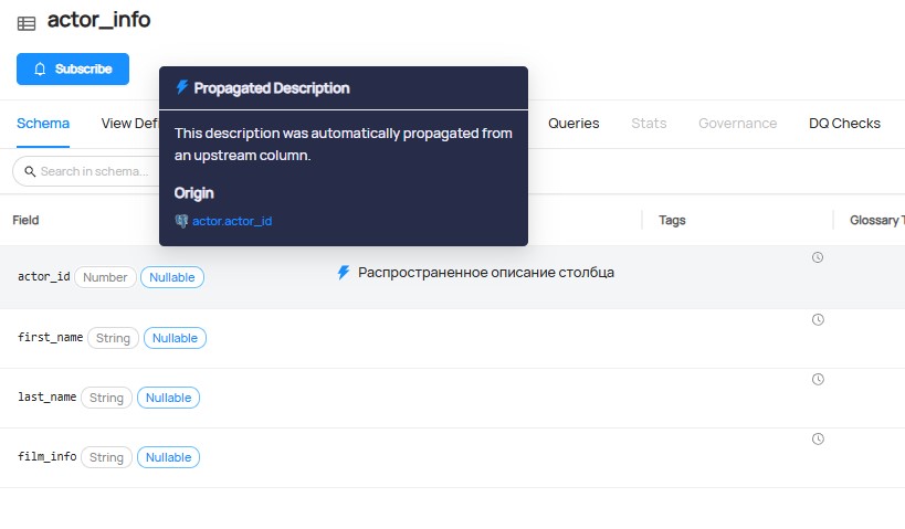 - Распространяются как описания, полученные для столбцов из источника с метаданными, так и описания, введенные через интерфейс;
