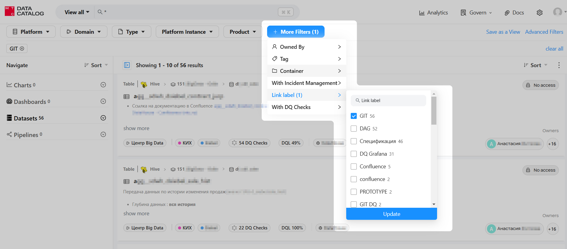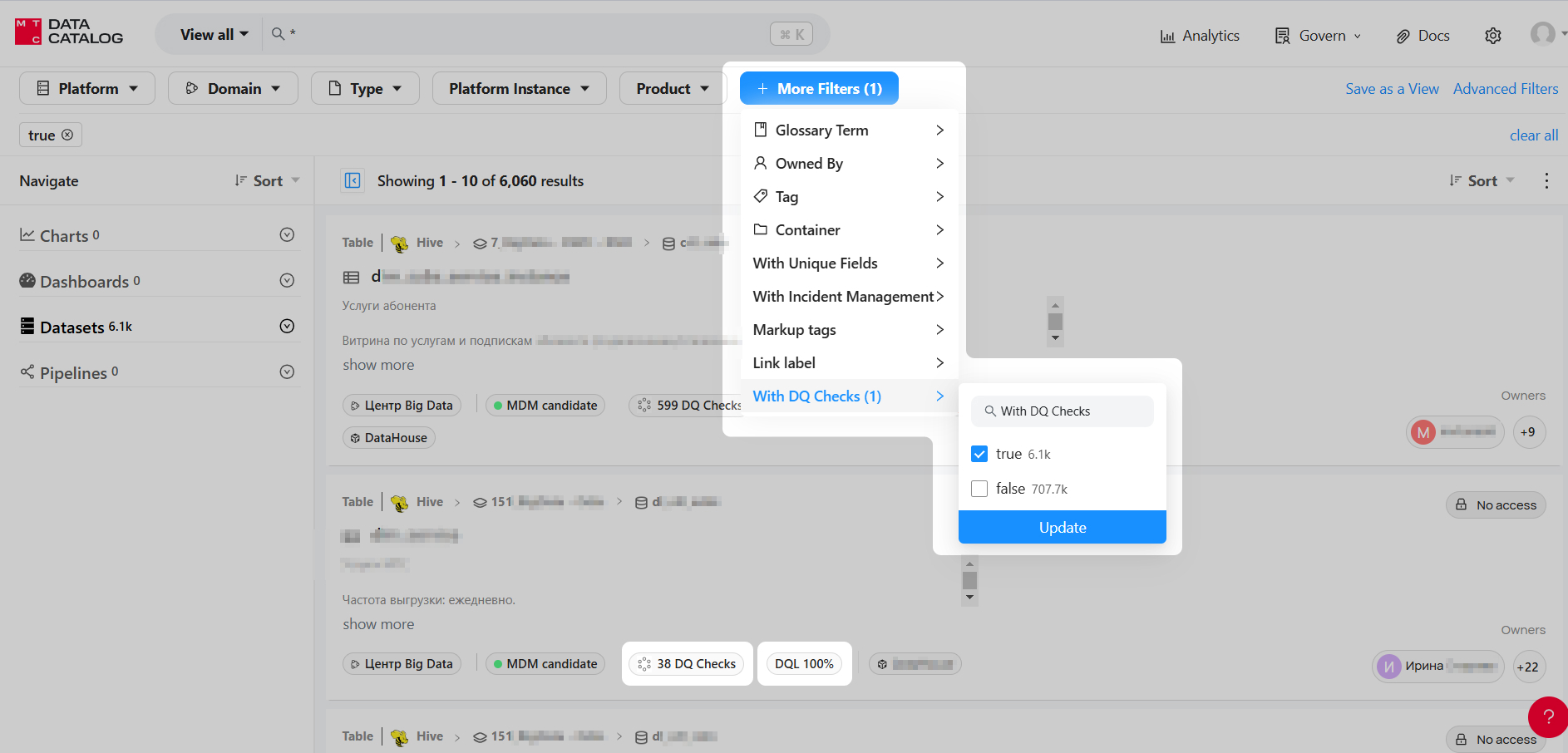 Используйте фильтр With DQ Checks для сортировки объектов в Каталоге данных по наличию или отсутствию проверок качества данных (DQ checks). Чтобы фильтровать результаты, выберите данное значение и установите флаг true. На странице поисковых результатов будут показаны только те объекты, которые соответствуют указанным критериям. Количество проверок для каждого объекта будет отображено на бейдже, что позволяет быстро оценить уровень мониторинга качества данных. Для тех объектов, которые успешно прошли все проверки, назначается бейдж, указывающий на процент качества по всем проверкам — DQL 100%.