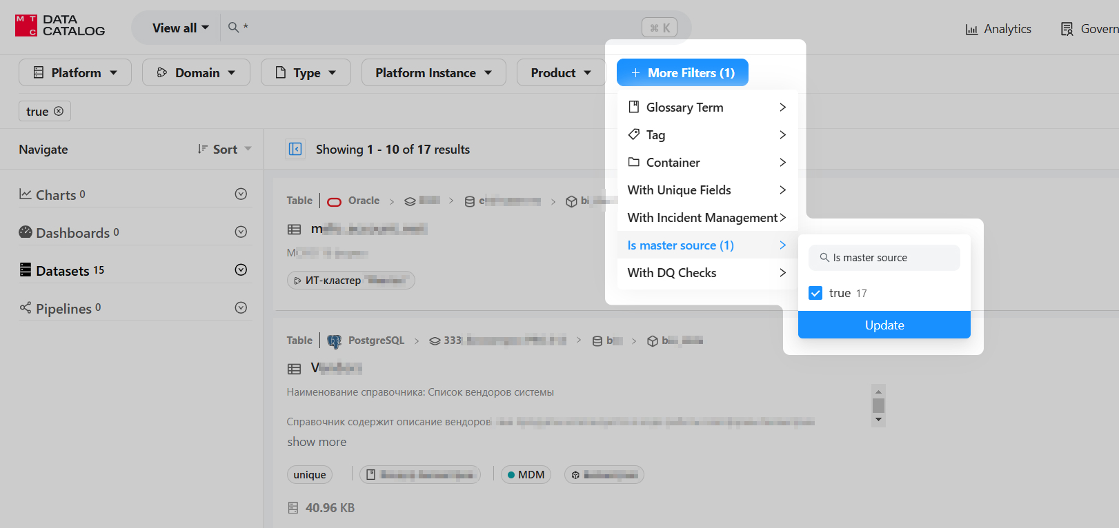 Выберите значение True в фильтре Master Source, это покажет в поисковой выдаче только те объекты, для которых существует термин, являющийся Master Source для объекта. Это значит, что владелец данных вручную определил, что объект является достоверным источником данных по термину. Связь Master Source также видна на странице объекта, в правой боковой панели, в разделе Glossary Terms. Подробнее как связать термин и объект можно прочитать здесь. Карточка объекта в поисковой выдаче не имеет никаких пометок о наличии Master Source термина.