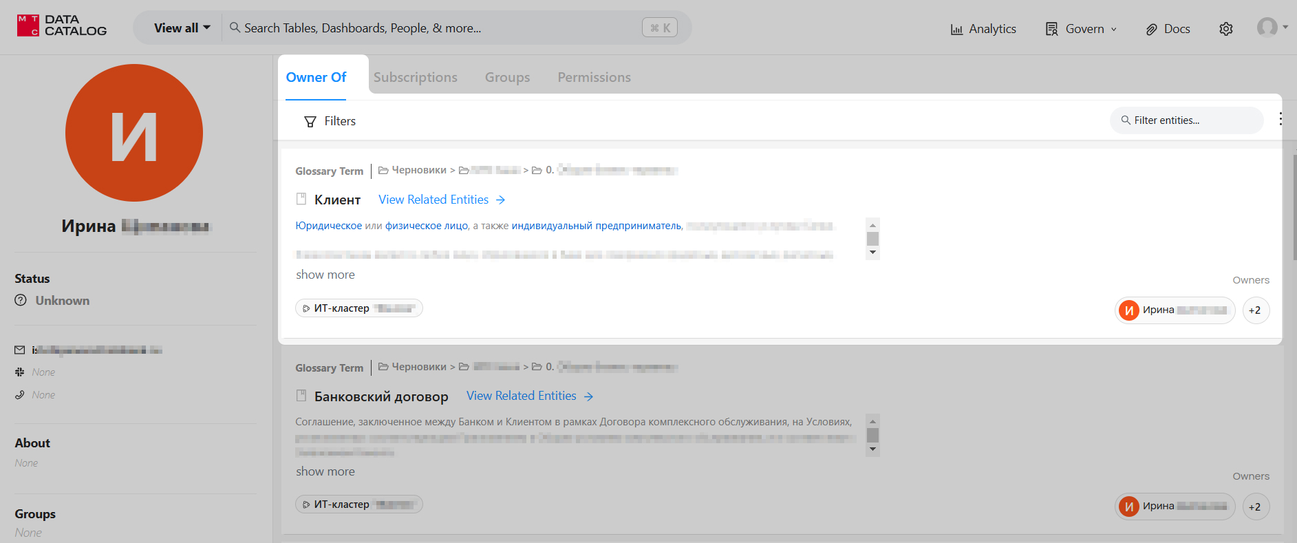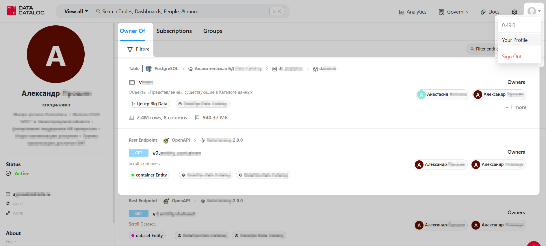 Чтобы просмотреть все объекты Каталога данных, владельцем которых Вы являетесь, нужно на странице вашего профиля Your Profile, нажав на иконку с аватаром пользователя перейти в раздел Owner Of. Здесь отобразятся все объекты у которых вы появляетесь в разделе Owner. Чтобы найти интересующий вас объект можно воспользоваться фильтрами.
