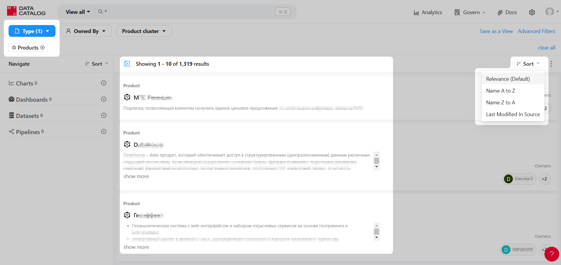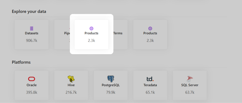 Чтобы получить доступ к списку всех Продуктов, перейдите на главную страницу Каталога данных и выберите панель Products.