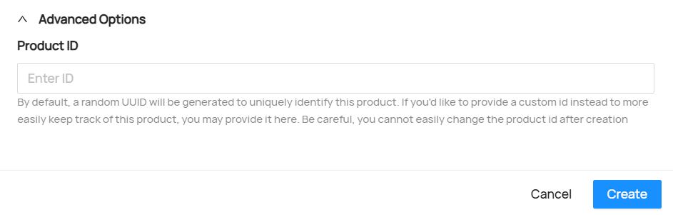 При нажатии на раздел расширенные параметры (Advanced Options) отобразится поле Product Id. В этом поле можно указать часть URN создаваемого Продукта. Эта опция будет полезна, если есть необходимость сделать URN Продукта человекочитаемым. Важно: после того, как Продукт был создан, изменить его URN нельзя.