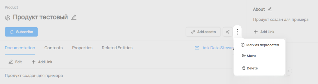 - Связанные объекты (Related Entities): Список объектов (могут быть контейнеры, датасеты, термины и др.), которые имеют отношение к данному Продукту. Эти связи также могут быть просмотрены со страницы связанного объекта на правой боковой панели.