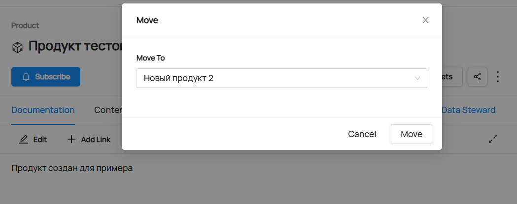 Чтобы переместить Продукт, нужно нажать на три точки рядом с названием объекта и выбрать пункт Move. В появившемся меню введите название Родительского продукта и подтвердите перемещение объекта, нажав на Move.