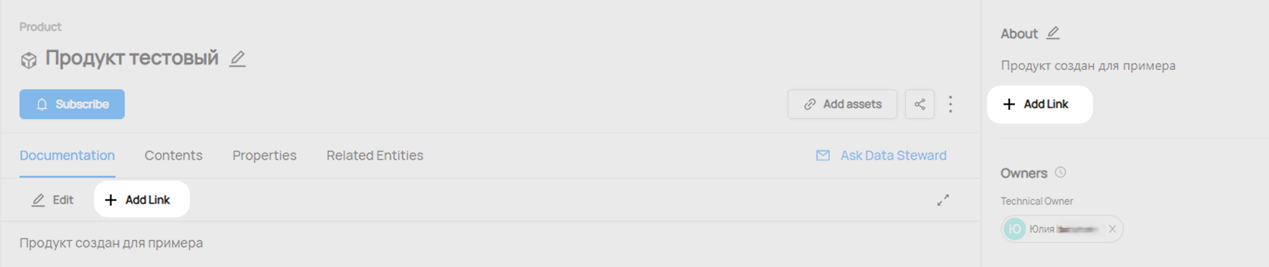 - Описание Продукта (About). Можно редактировать с помощью кнопки Add documentation в правой боковой панели или с помощью кнопки Edit на вкладке Documentation.