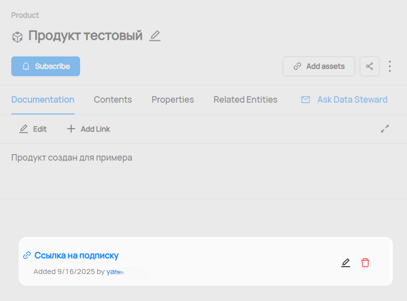 После создания ссылка отображается на вкладке Документация под описанием Продукта. Под этой ссылкой указывается дата добавления и логин пользователя (логин является переходом на страницу профиля пользователя в Data Cat). При наведении курсора справа от ссылки появляются кнопки редактирования и удаления ссылки.