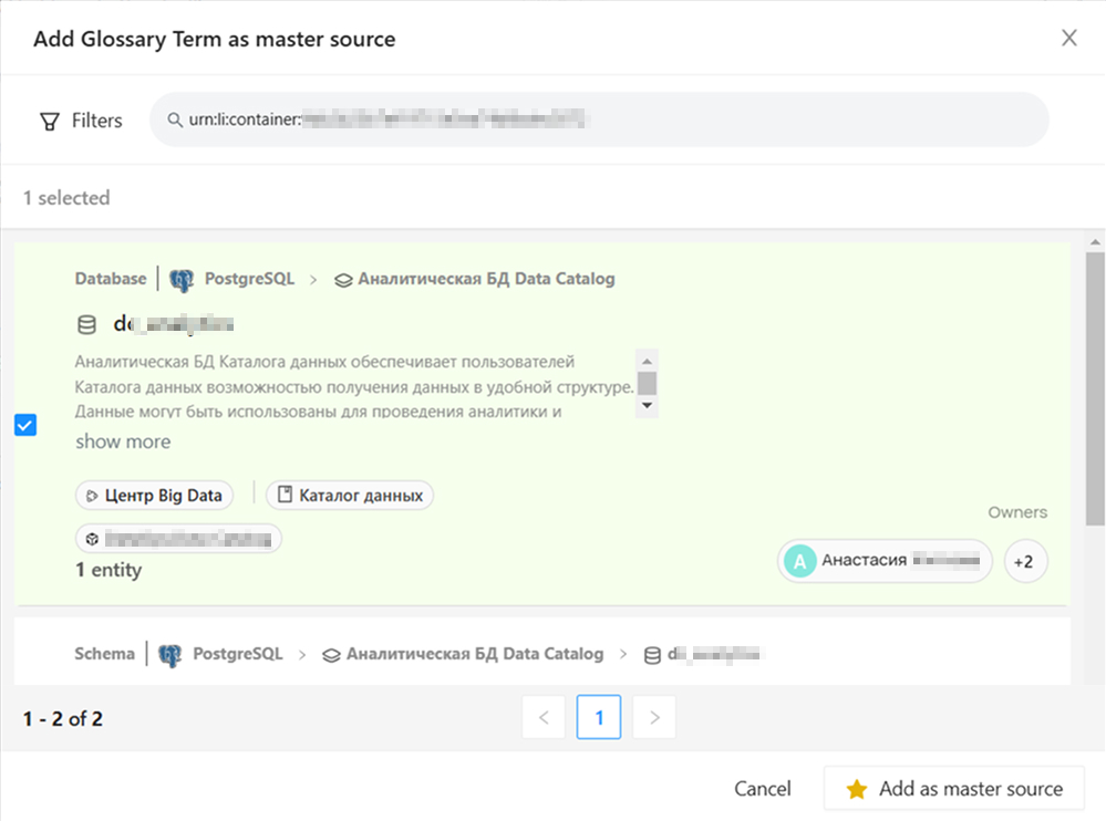 По нажатию на кнопку Add as a Master Source можно установить связь между термином и объектом в Каталоге. В открывшемся окне необходимо найти соответствующие объекты, отметить объект с помощью чекбокса и подтвердить сохранение изменений.