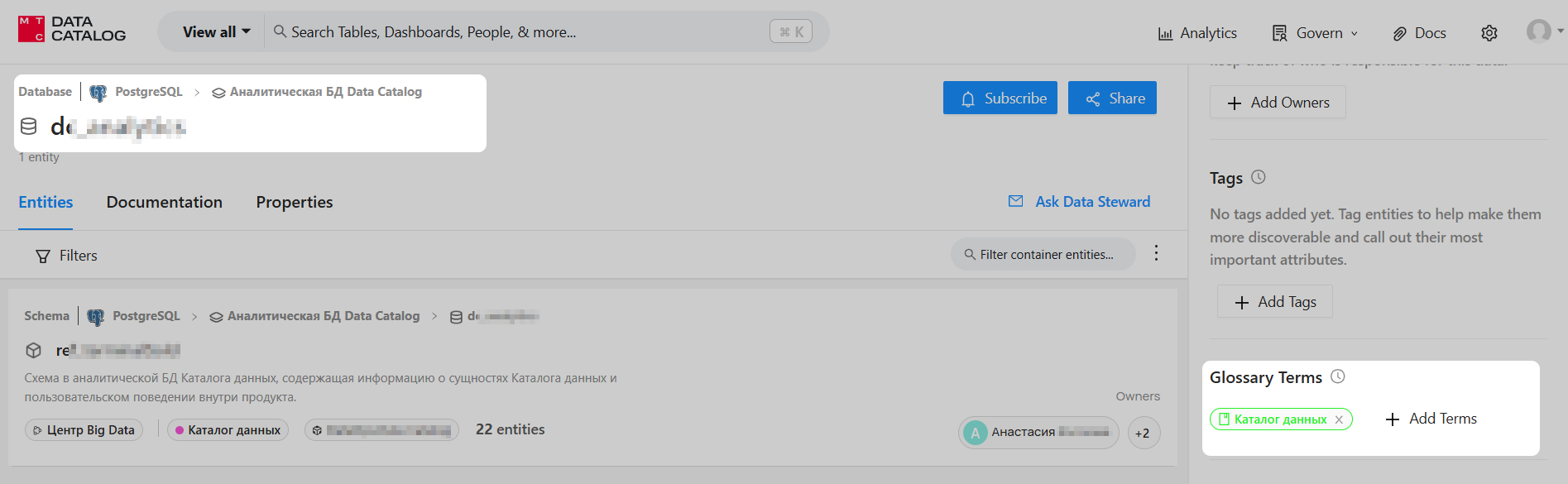 На странице объекта связь с термином можно отследить в правой боковой панели, в разделе Glossary Terms. В этом разделе появится бейдж зелёного цвета с названием связанного Термина.