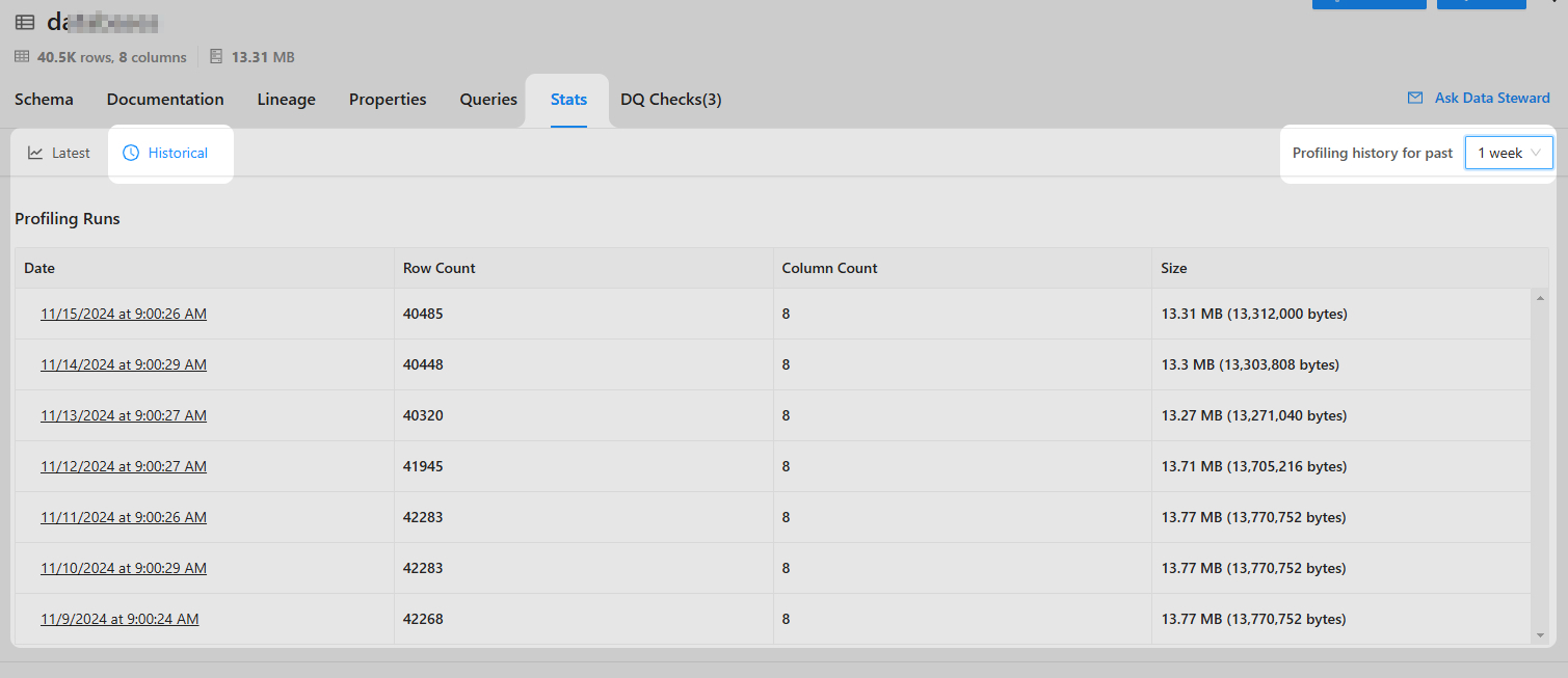 Для просмотра истории профилирования необходимо перейти в раздел Historical. Здесь представлены три раздела Profiling Runs - ссылки на данные профилирования при предыдущем запуске инджестора, Table Stats - статистика по таблицам, Column Stats - статистика по колонкам/полям.
